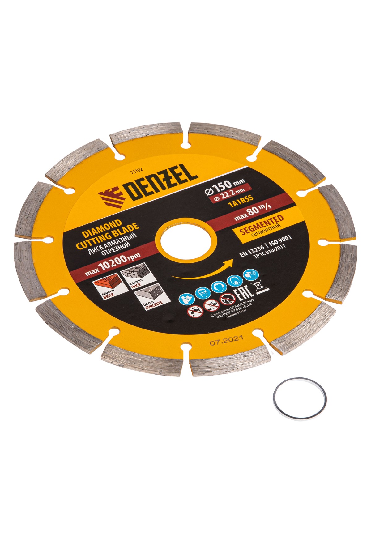 Отрезной сегментный алмазный диск Denzel 73102 диаметром 150 х 22,2 мм — оснастка для УШМ, использующаяся для сухой резки свежего и старого бетона, камня, кирпича, шлакоблока, мрамора, тротуарной плитки, гранита. Диск сегментного типа отличается высокой производительностью даже при интенсивных нагрузках. Подходит для бытового и профессионального использования.