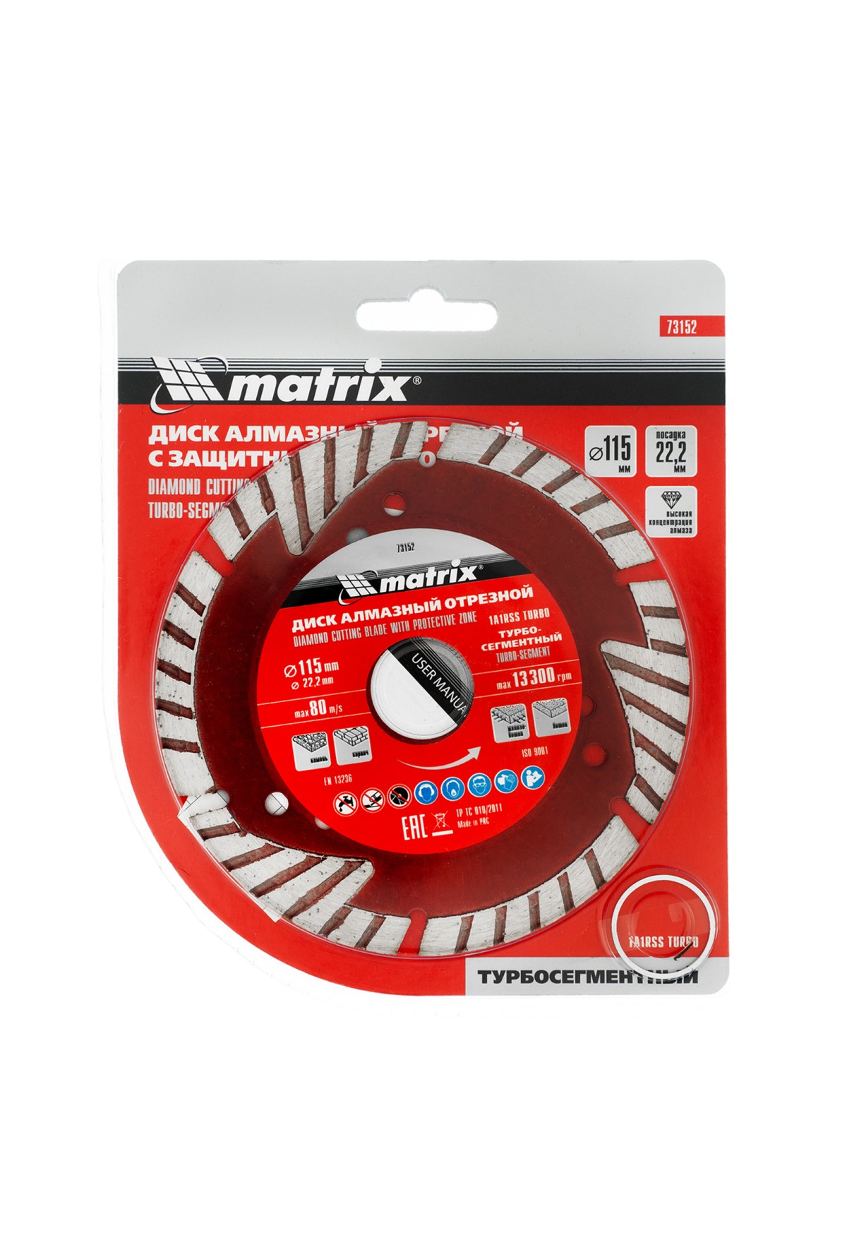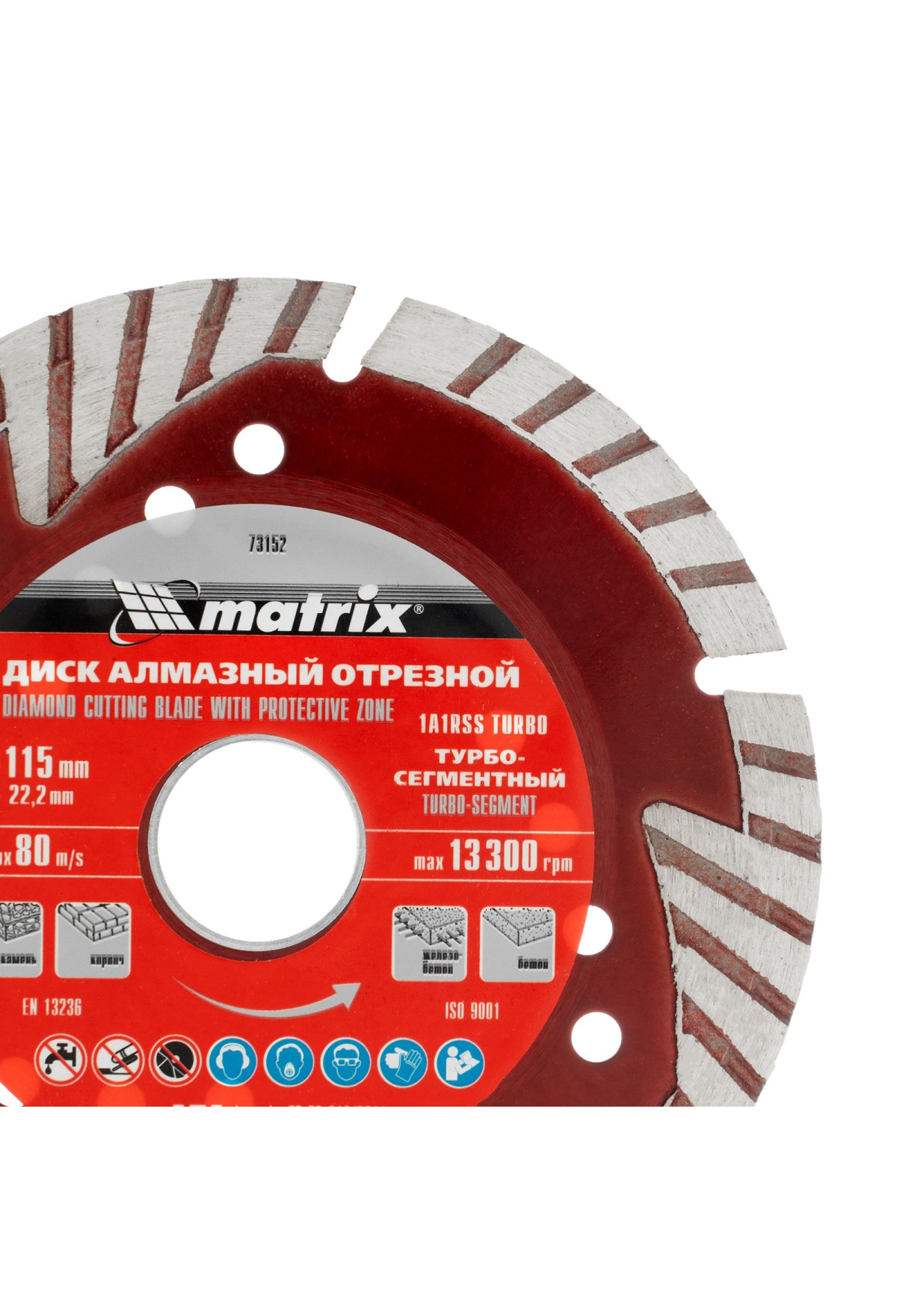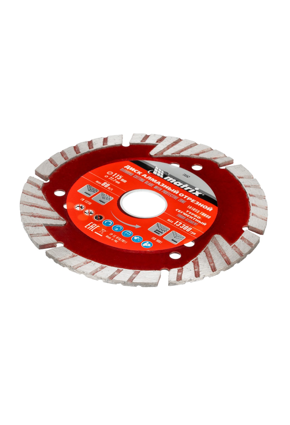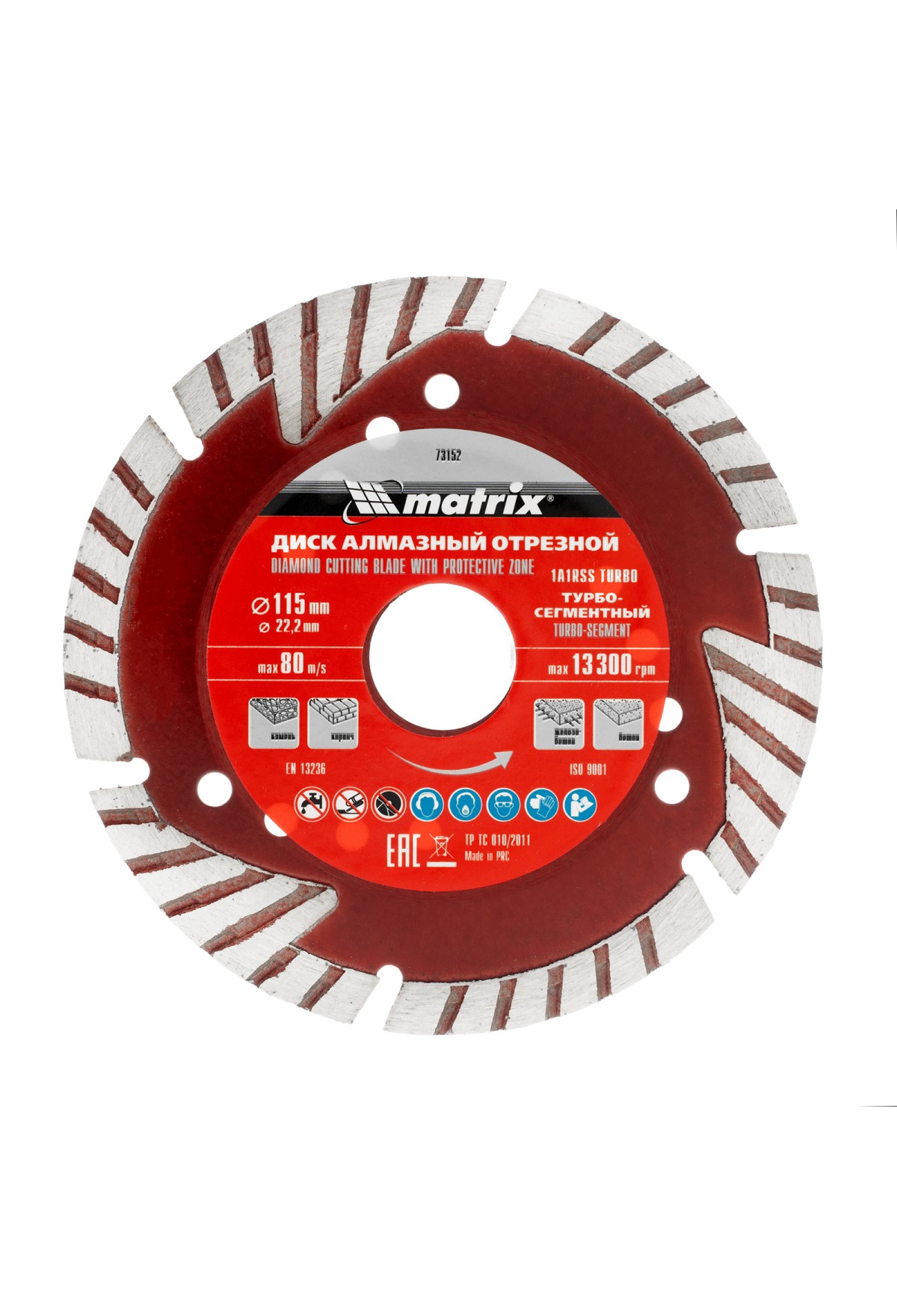 Алмазный отрезной сегментный диск Matrix 73152 с защитными секторами, диаметром 115 х 22,2 мм, применяется для сухой резки бетона разной прочности, камня, кирпича, шлакоблока и тротуарной плитки. Используется как оснастка для углошлифовальных машин с соответствующим посадочным диаметром. Диск изготовлен методом холодного прессования и выдерживает повышенные нагрузки при прохождении арматуры в слабоармированном железобетоне.