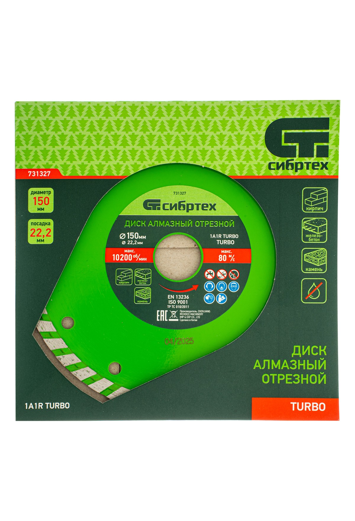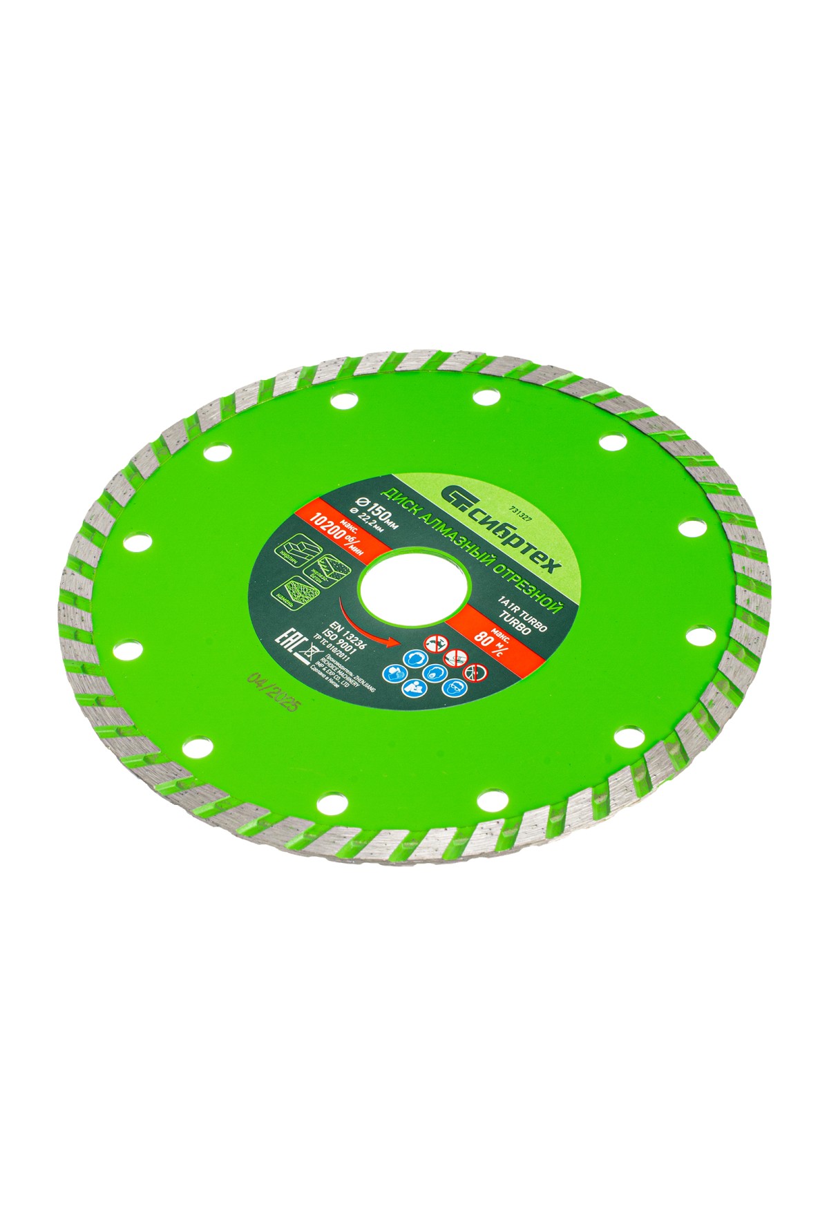 Алмазный отрезной диск Сибртех Turbo 731327 для сухой резки, диаметром 150 х 22,2 мм, устанавливается на углошлифовальную машину. Позволяет резать твердые материалы: бетон, железобетон, камень, песчаник. Диск предназначен для бытового использования.