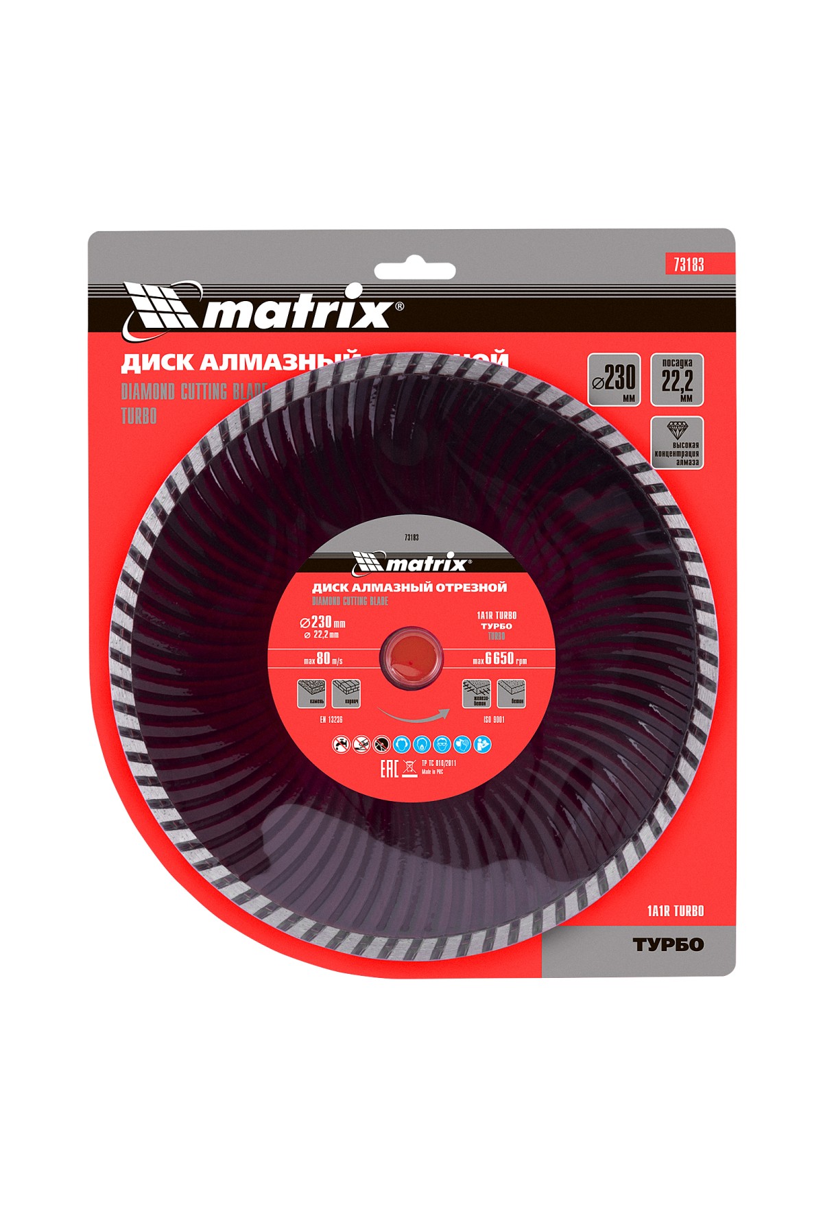 Отрезной алмазный диск Matrix Turbo 73183 диаметром 230 х 22,2 мм, предназначен для сухой резки. Используется в качестве сменной оснасткой для углошлифовальных машин (УШМ) во время ремонта и мелкого строительства, а также в быту. Позволяет работать по бетону, в том числе свежему и среднеармированному, камню и кирпичу.