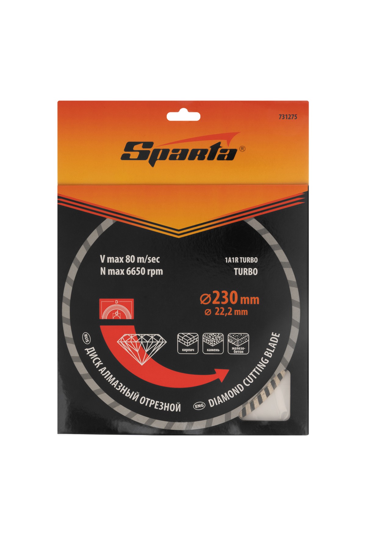 Алмазный отрезной диск Sparta Turbo 731275 для сухой резки, диаметром 230 х 22,2 мм, устанавливается на углошлифовальную машину. Позволяет резать твердые материалы: бетон, железобетон, камень, песчаник. Диск предназначен для бытового использования.