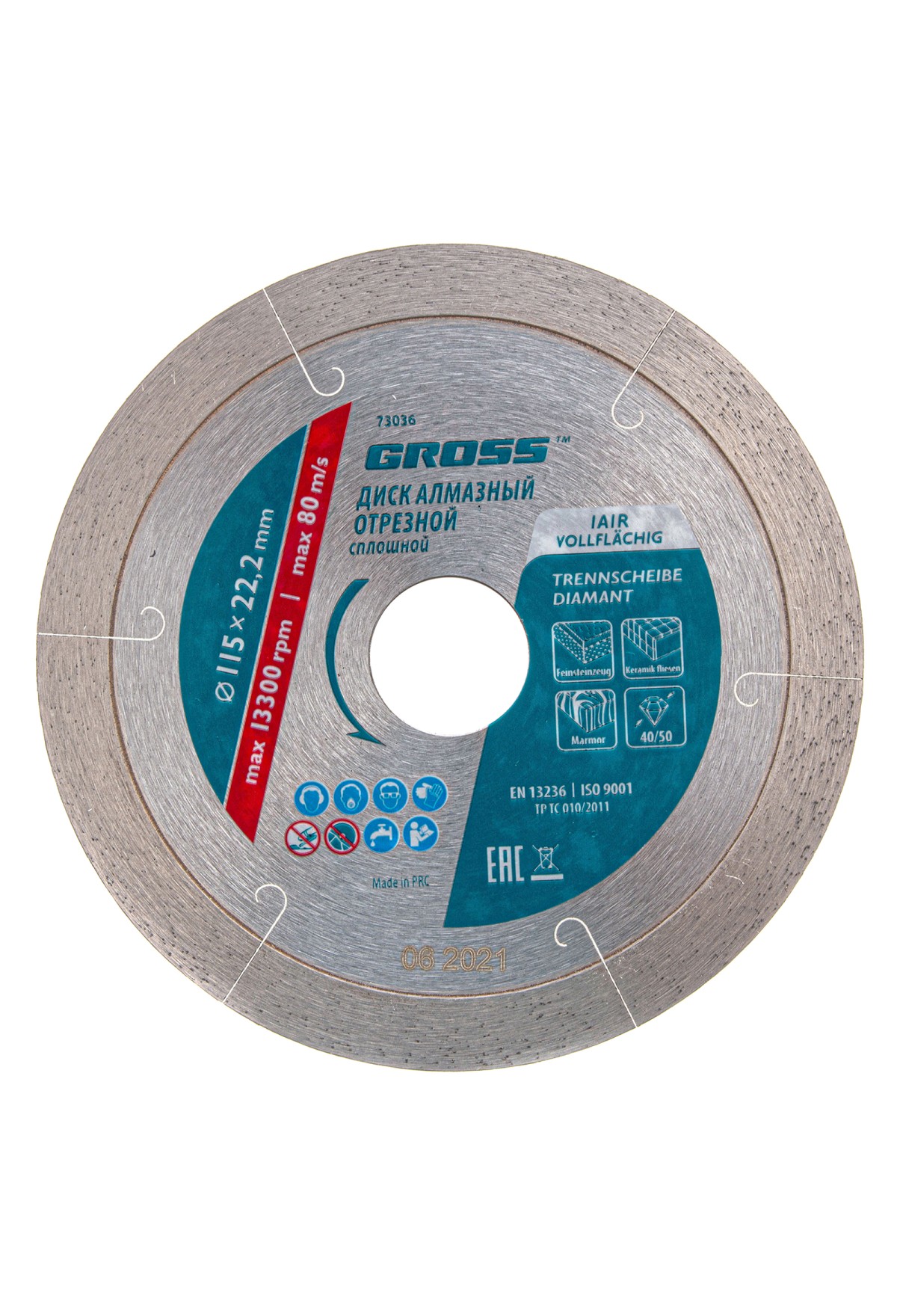 Сплошной алмазный диск Gross ф115 х 22,2 мм 73036 с лазерной перфорацией, для мокрого резания, используется в качестве расходника на УШМ или плиткорезах с посадочным размером 22,2 мм. Оптимальное соотношение серебра, кобальта и других качественных компонентов в металлической связке позволяет работать с гранитом, керамикой, керамогранитом, мрамором, натуральным и искусственным камнем. Метод мокрого шлифования подразумевает использование водяного охлаждения, что способствует снижению перегрева и эффективному отводу пыли.