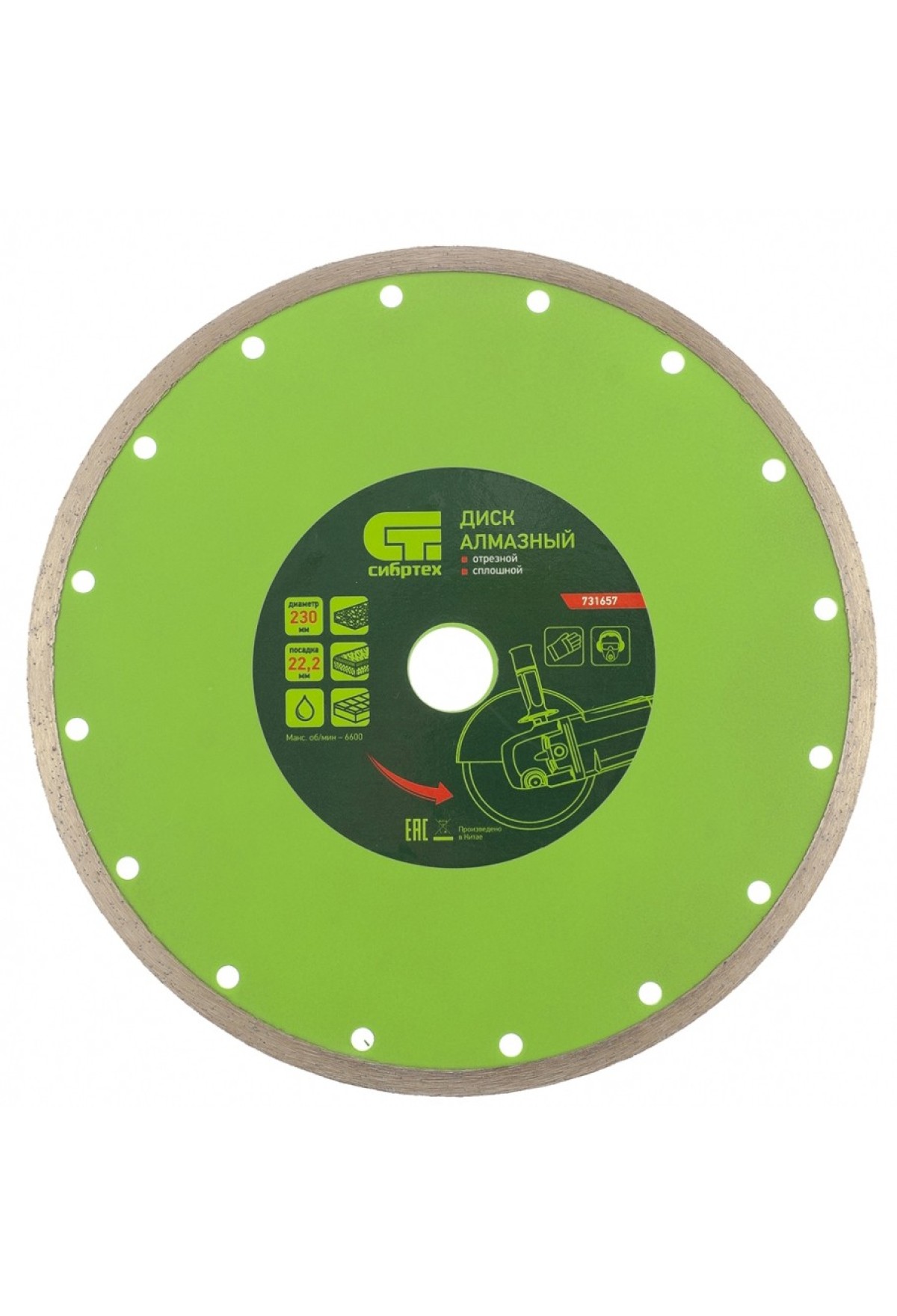 Алмазный отрезной сплошной диск Сибртех 731657 диаметром 230 х 22,2 мм применяется для мокрой резки керамогранитной, керамической плитки, а также мрамора и камня. Используется в качестве оснастки для болгарок и плиткорезов с посадочным диаметром 22,2 мм. Диск обладает хорошим рабочим ресурсом и рассчитан на долгую службу. Рез материалов необходимо проводить с использованием водяного охлаждения.
