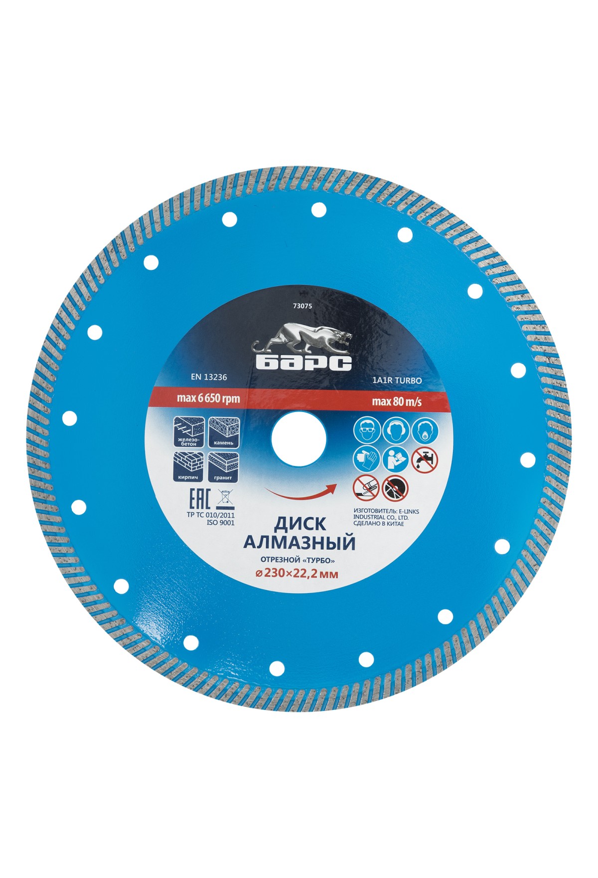 Алмазный диск Барс Турбо 73075 диаметром 230 х 22,2 мм предназначен для сухого резания бетона, в т.ч. свежего, среднеармированного железобетона, камня, кирпича, гранита и песчаника. Совместим с УШМ с посадочным диаметром 22,2 мм, используется для проведения строительных и ремонтных работ.