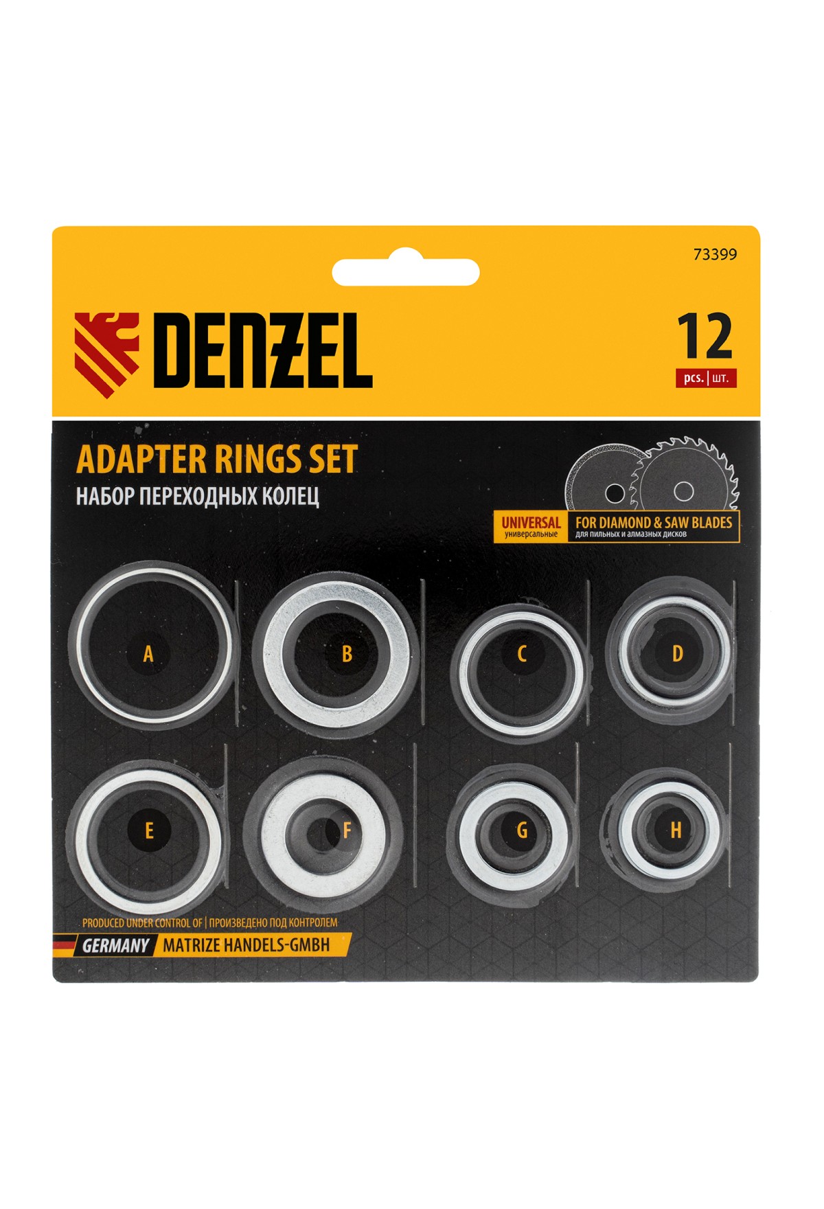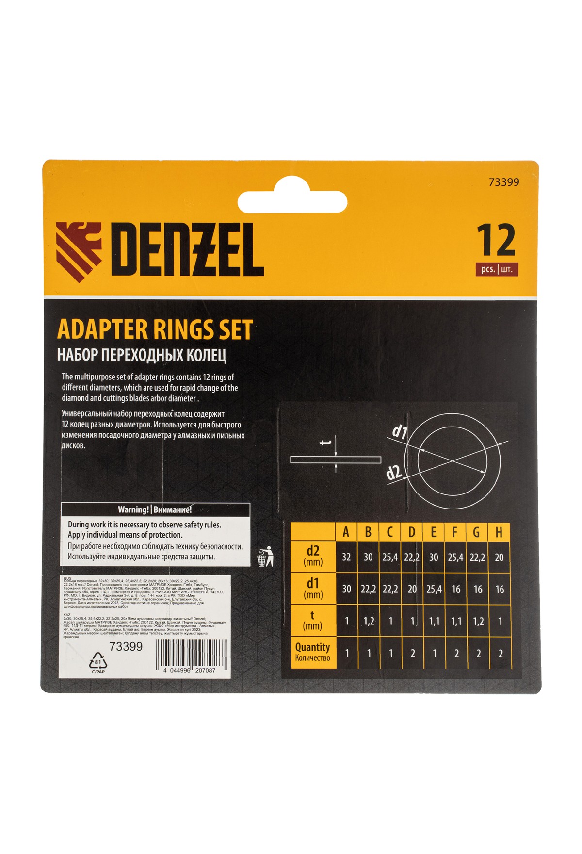 Переходные кольца Denzel 73399 диаметром 32 х 30, 30 х 25,4, 25,4 х 22,2, 22,2 х 20, 20 х 16, 30 х 22,2, 25,4 х 16, 22,2 х 16 мм предназначены для корректировки размера посадочного отверстия пильных и алмазных дисков. Используются для работы с циркулярными и торцовочными пилами. Комбинируя различные кольца из набора, можно добиться плотной посадки диска с любым посадочным диаметром.