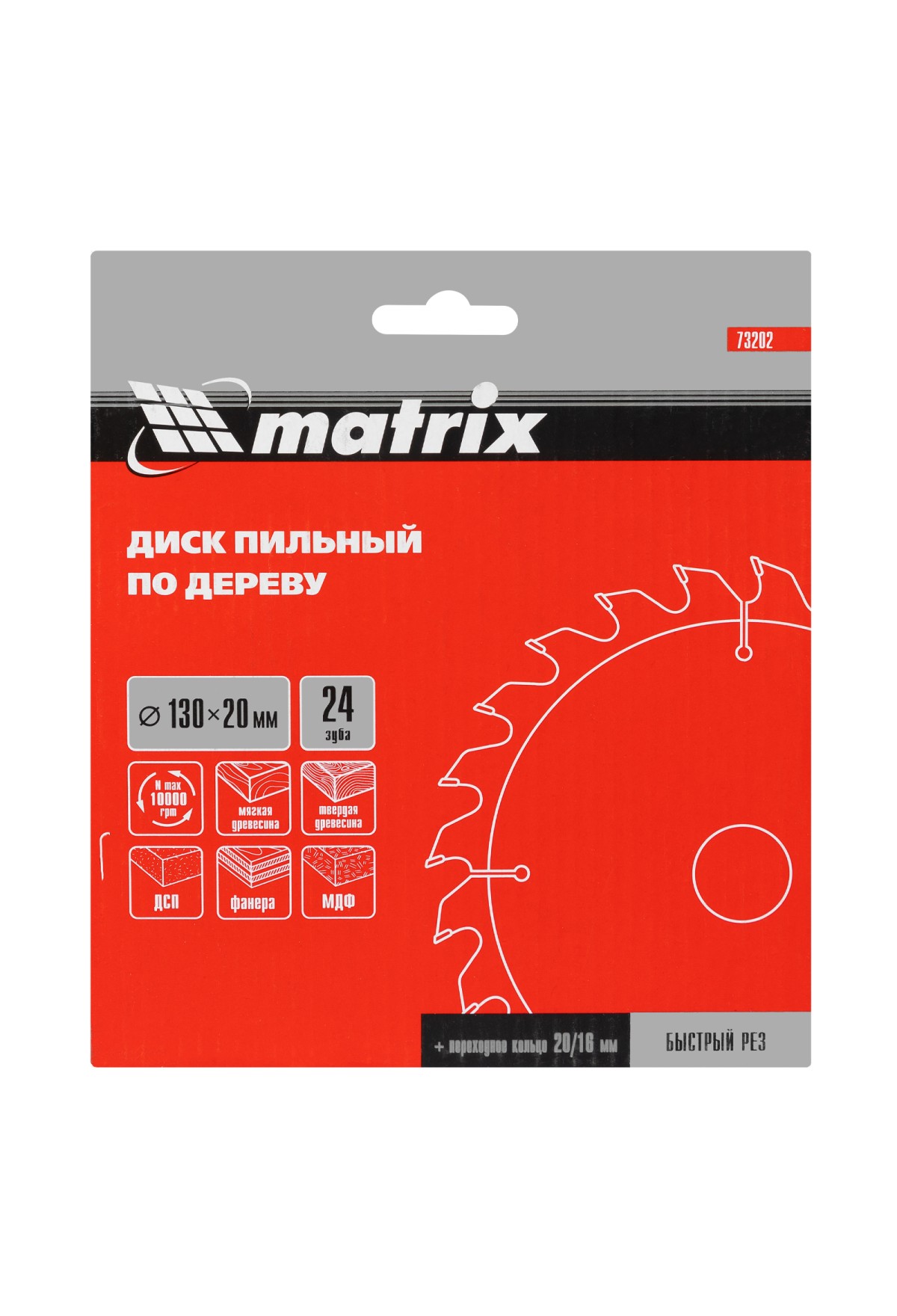 Пильный диск по дереву Matrix 73202 диаметром 130 х 20 мм, с 24 зубьями и переходным кольцом 20/16, — оснастка для циркулярных и торцовочных пил с соответствующим посадочным и внешним диаметром. Используется для продольного/поперечного реза материалов из мягкой и твердой древесины, ДСП, ДВП, фанеры, столярных плит. В комплект поставки входит переходное кольцо 20/16, позволяющее самостоятельно изменить посадочный диаметр при необходимости. Диск подходит для бытового и профессионального применения.