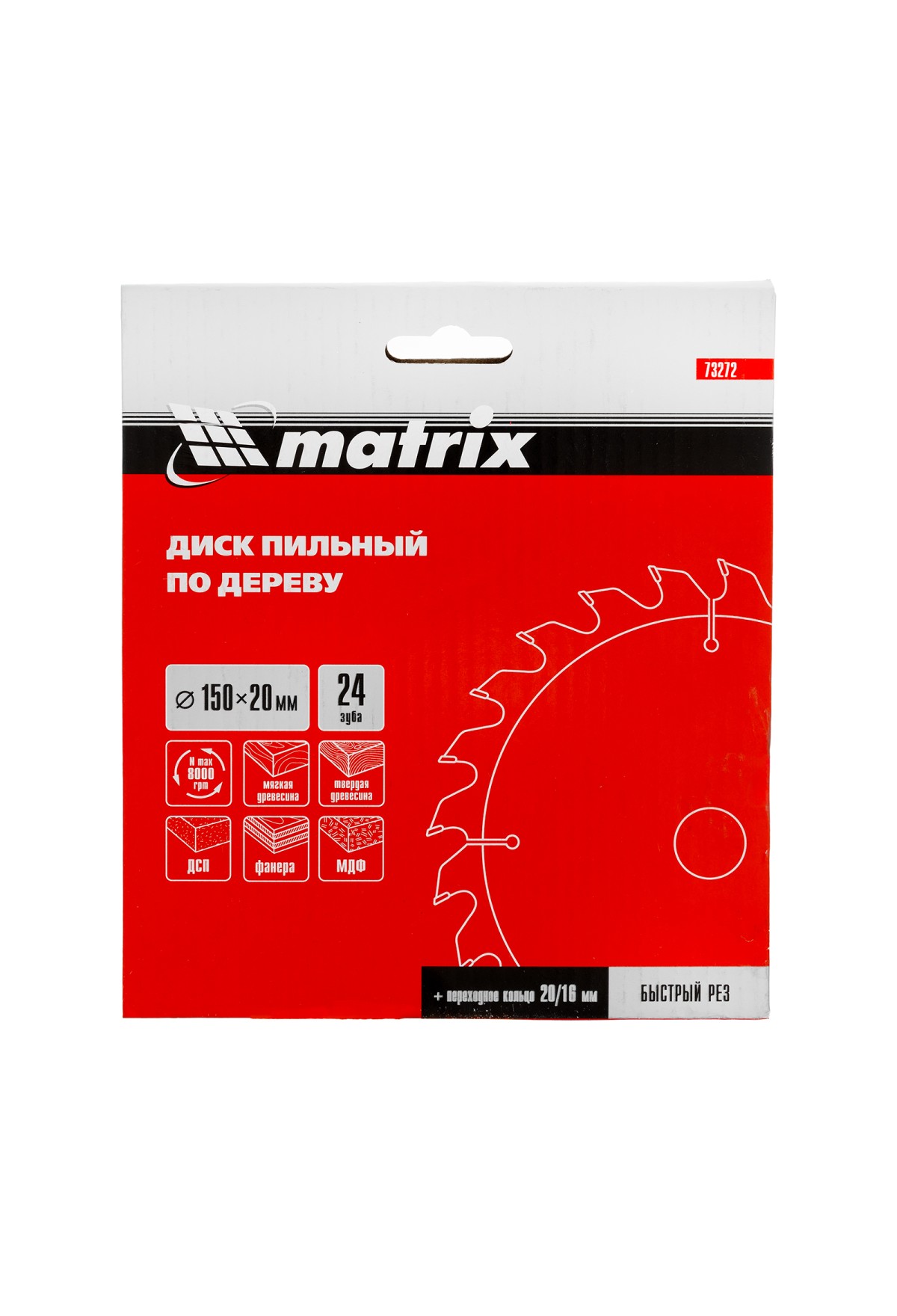 Пильный диск по дереву Matrix 73272 диаметром 150 х 20 мм, с 24 зубьями и переходным кольцом 20/16, — оснастка для циркулярных и торцовочных пил с соответствующим посадочным и внешним диаметром. Используется для продольного/поперечного реза материалов из мягкой и твердой древесины, ДСП, ДВП, фанеры, столярных плит. В комплект поставки входит переходное кольцо 20/16, позволяющее самостоятельно изменить посадочный диаметр при необходимости. Диск подходит для бытового и профессионального применения.