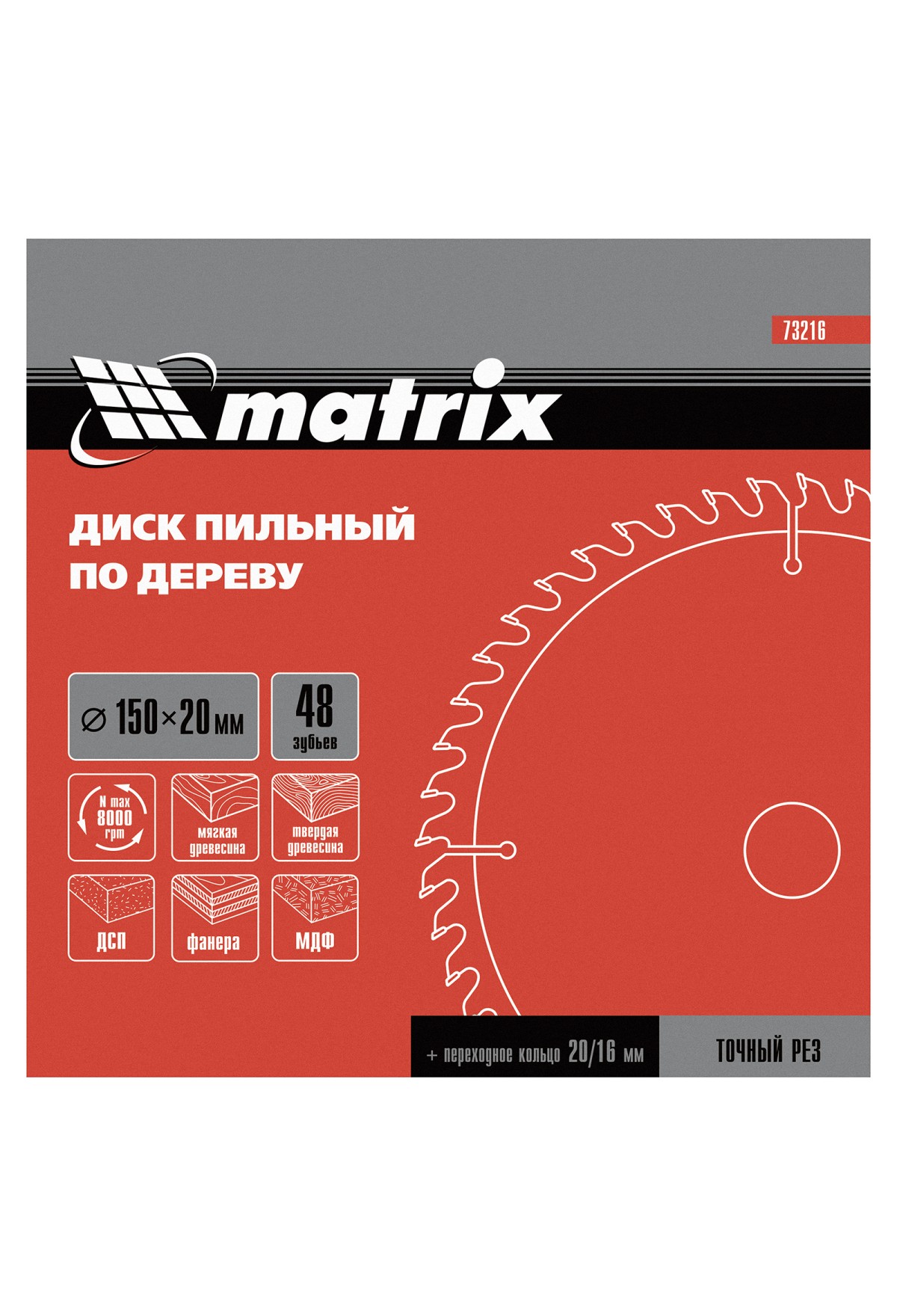 Пильный диск по дереву Matrix 73216 диаметром 150 х 20 мм, с 48 зубьями и переходным кольцом 20/16, — оснастка для циркулярных и торцовочных пил с соответствующим посадочным и внешним диаметром. Используется преимущественно для поперечного реза материалов из мягкой и твердой древесины, ДСП, ДВП, фанеры, столярных плит. В комплект поставки входит переходное кольцо 20/16, позволяющее самостоятельно изменить посадочный диаметр при необходимости. Диск подходит для бытового и профессионального применения.