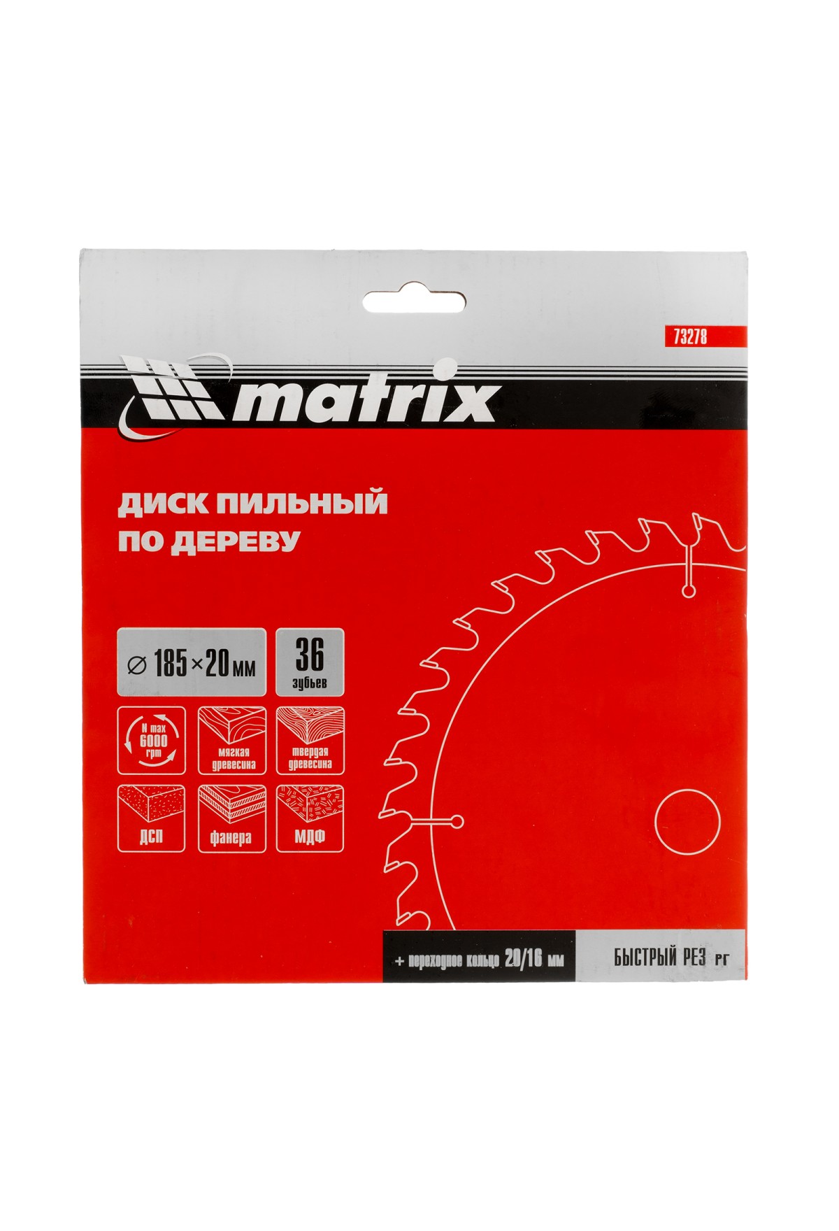 Пильный диск по дереву Matrix 73278 диаметром 185 х 20 мм, с 36 зубьями и переходным кольцом 20/16, — оснастка для циркулярных и торцовочных пил с соответствующим посадочным и внешним диаметром. Используется для продольного/поперечного реза материалов из мягкой и твердой древесины, ДСП, ДВП, фанеры, столярных плит. В комплект поставки входит переходное кольцо 20/16, позволяющее самостоятельно изменить посадочный диаметр при необходимости. Диск подходит для бытового и профессионального применения.