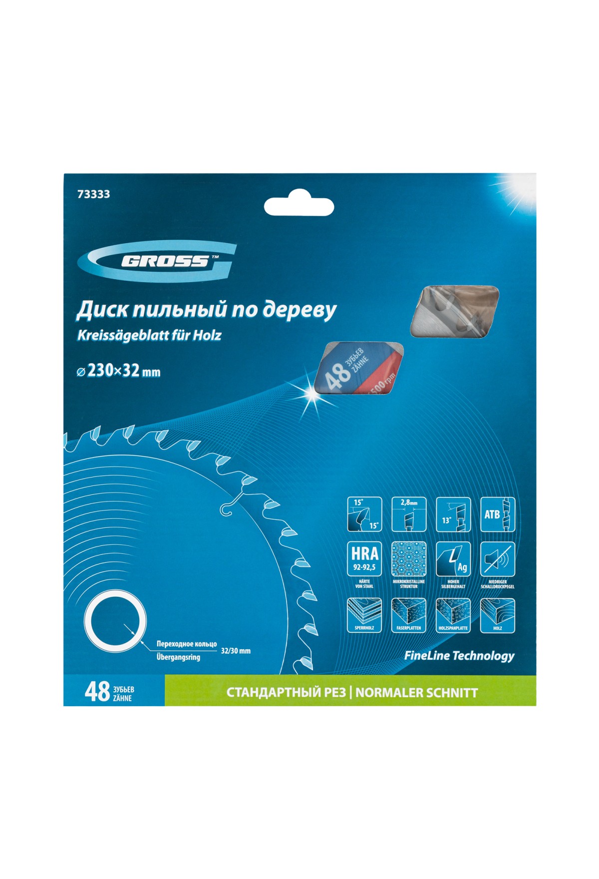 Пильный диск Gross 73333 диаметром 230 х 32 мм, с 48 зубьями и переходным кольцом 32/30 мм, предназначен для распила древесины мягких и твердых пород, ДСП, МДФ и фанеры. Используется в качестве оснастки для циркулярных и торцовочных пил с посадочным диаметром 32 мм, благодаря универсальному типу зубьев АТВ используется преимущественно для поперечного реза материалов. Диск изготовлен на высококачественном оборудовании, специально рассчитан на профессиональное применение и выполнение большого объема работ.