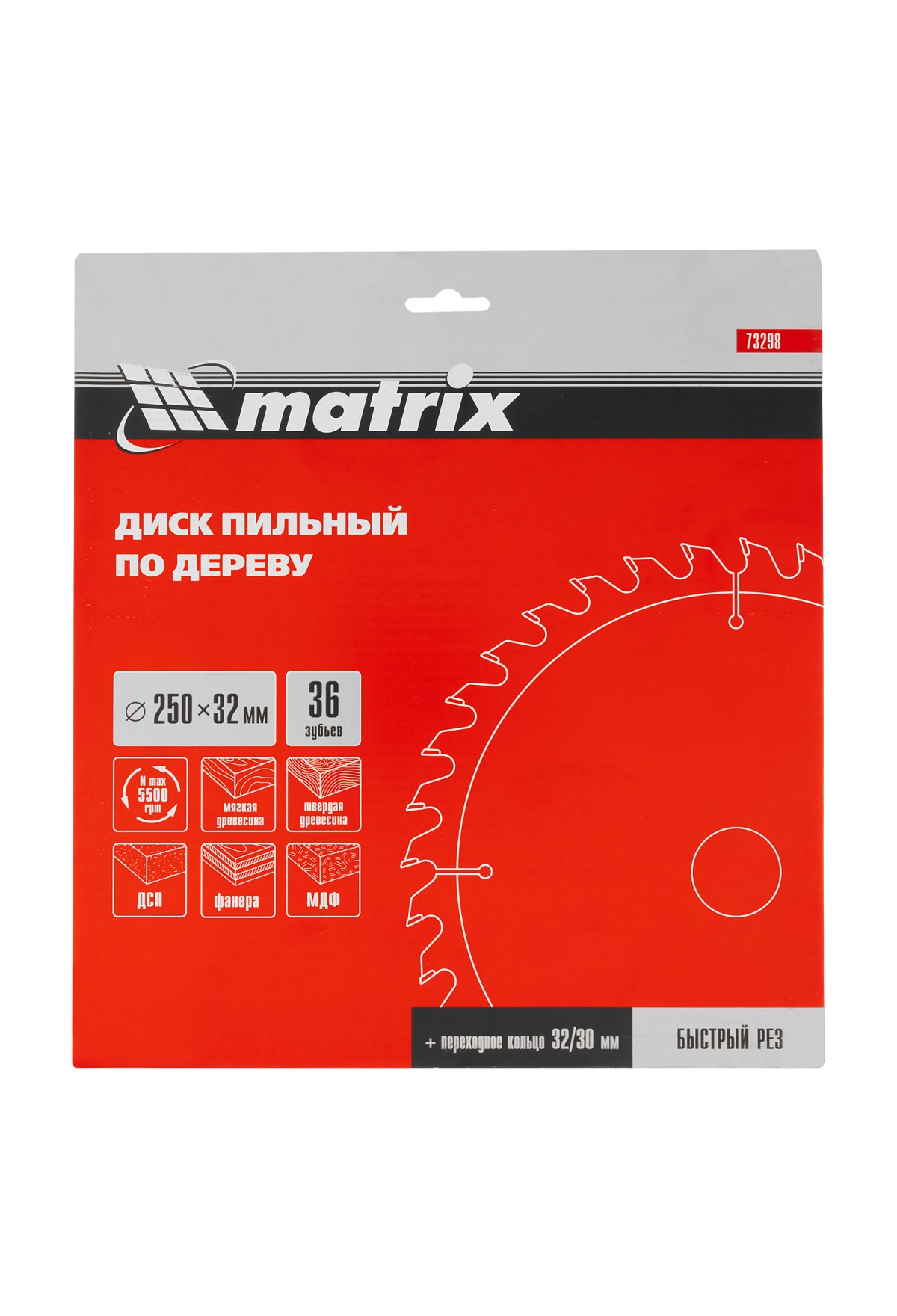 Пильный диск по дереву Matrix 73298 диаметром 250 х 32 мм, с 36 зубьями и переходным кольцом 32/30, — оснастка для циркулярных и торцовочных пил с соответствующим посадочным и внешним диаметром. Используется для продольного/поперечного реза материалов из мягкой и твердой древесины, ДСП, ДВП, фанеры, столярных плит. В комплект поставки входит переходное кольцо 32/30, позволяющее самостоятельно изменить посадочный диаметр при необходимости. Диск подходит для бытового и профессионального применения.