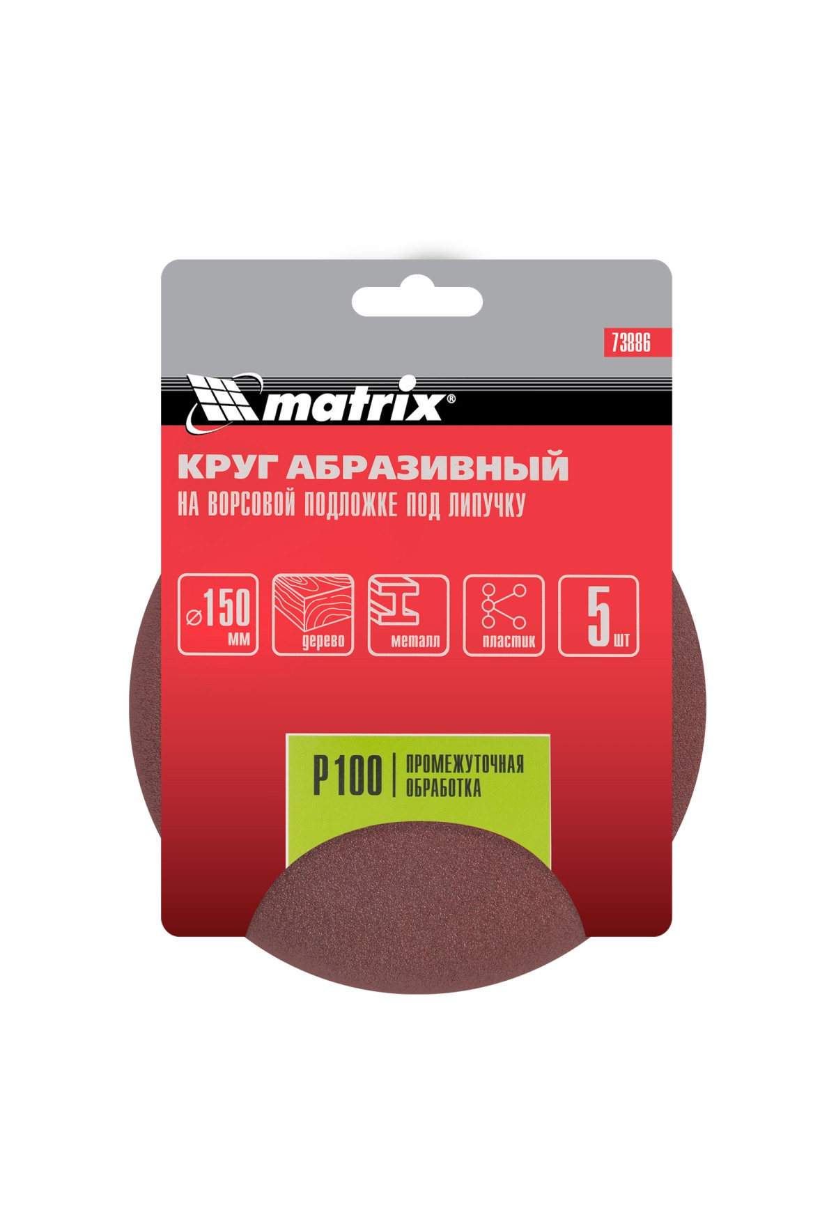 Абразивный круг на ворсовой подложке под «липучку» Matrix Р100 арт. 73886 используется для промежуточного шлифования металла, дерева, пластика и других поверхностей. Круг устанавливается на эксцентриковые (орбитальные) шлифовальные машинки или на дрель с помощью опорной насадки Matrix.