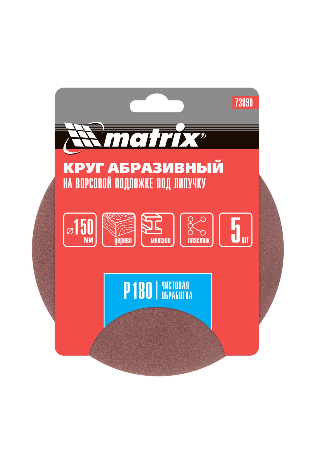 Технические характеристики Круг абразивный на ворсовой подложке под "липучку", P 180, 150 мм, 5 шт Matrix