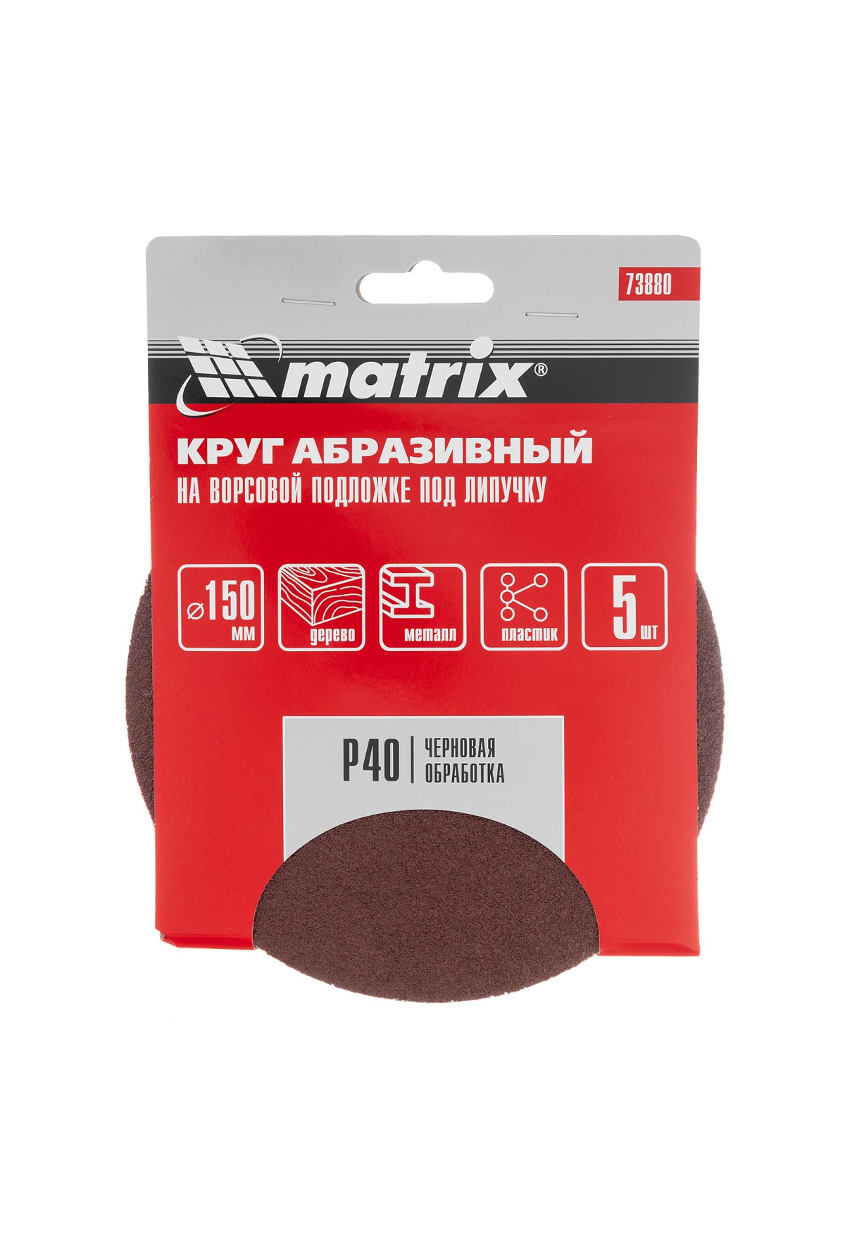 Абразивный круг на ворсовой подложке под «липучку» Matrix Р40 арт. 73880 используется для сухого чернового шлифования металла, дерева, пластика и других поверхностей. Круг устанавливается на эксцентриковые (орбитальные) шлифовальные машинки или на дрель с помощью опорной насадки Matrix.