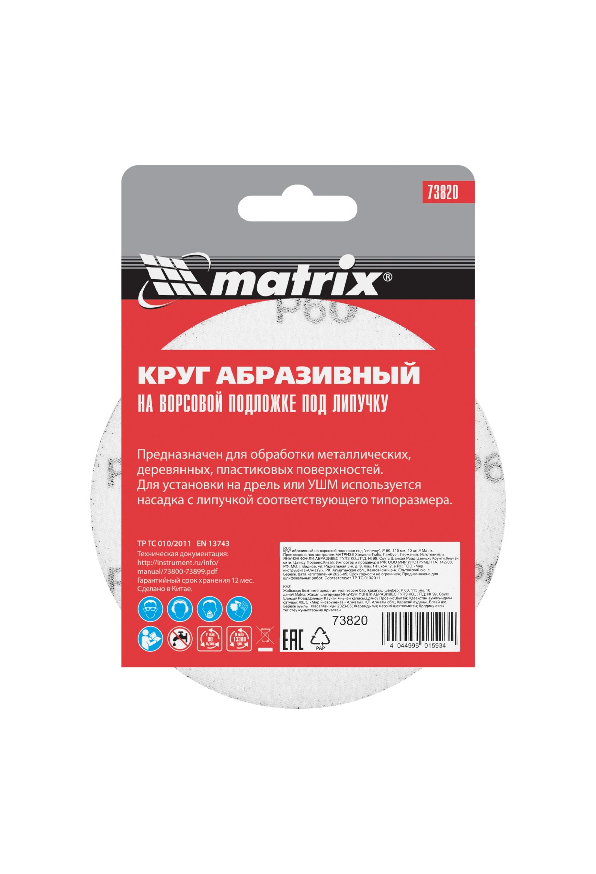 Технические характеристики Круг абразивный на ворсовой подложке под "липучку", P 60, 115 мм, 10 шт Matrix