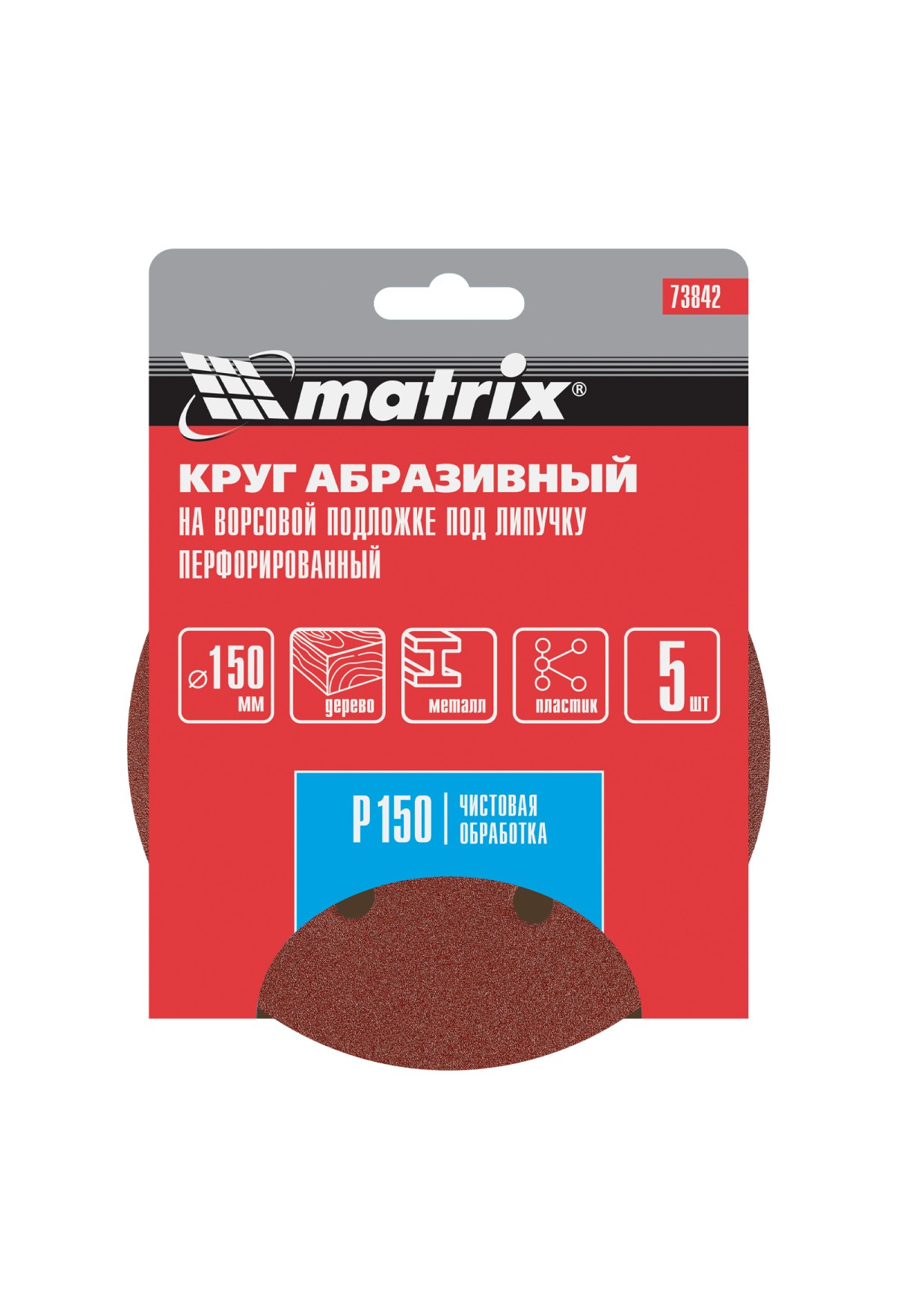 Технические характеристики Круг абразивный на ворсовой подложке под "липучку", перфорированный, P 150, 150 мм, 5 шт Matrix