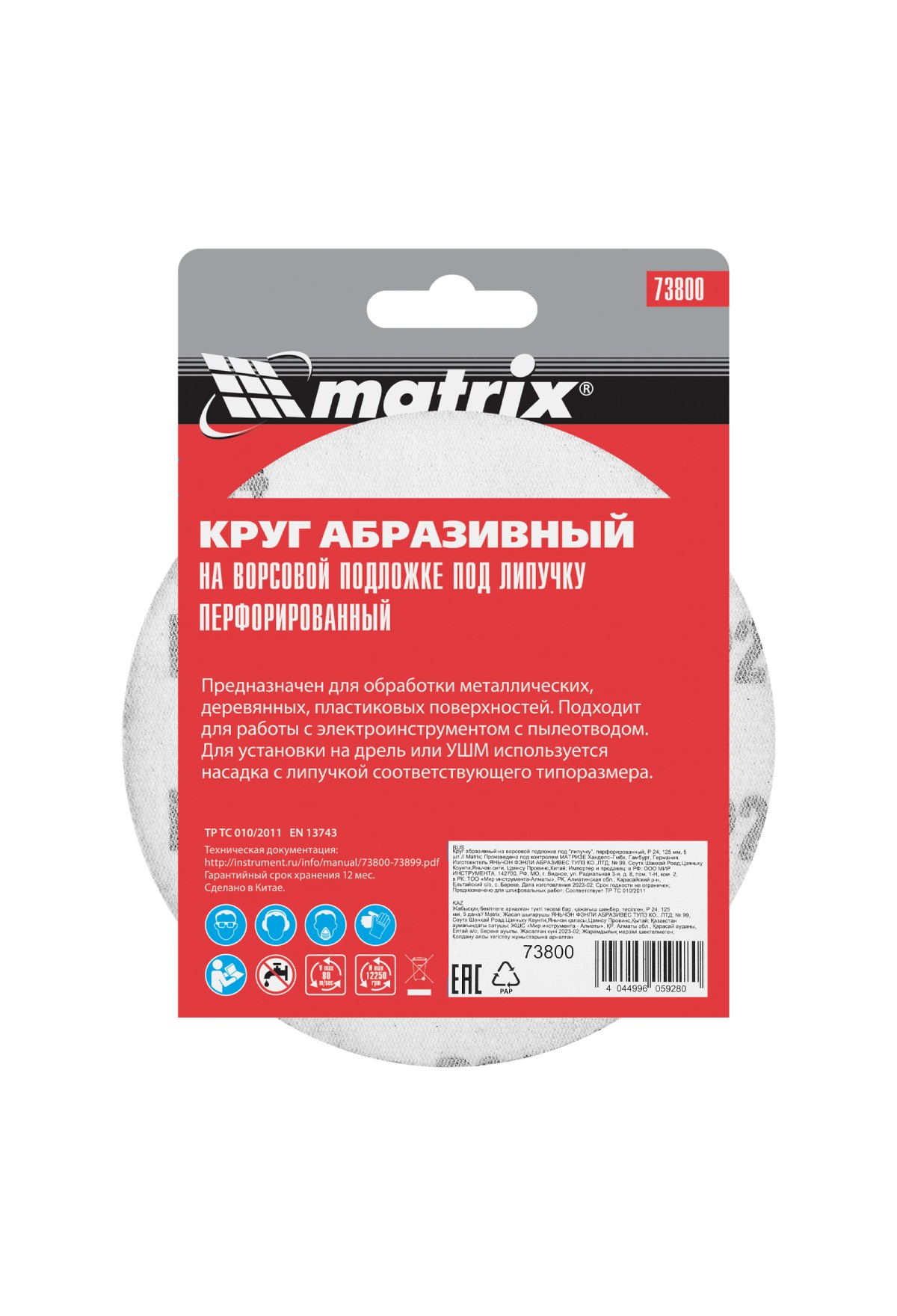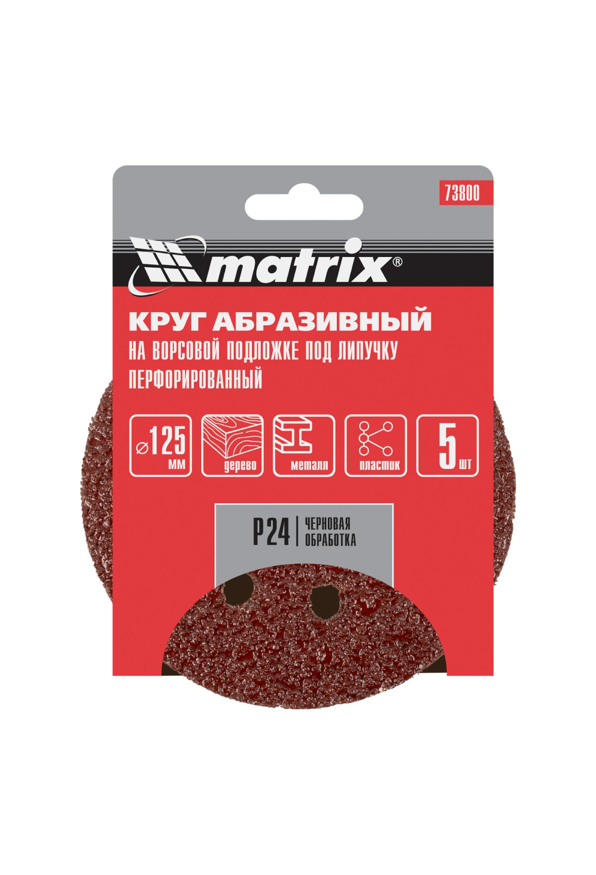 Перфорированный абразивный круг Matrix 73800 диаметром 125 мм, с крупнозернистым абразивом P 24, на ворсовой подложке под «липучку», 5 шт. в упаковке, используется для сухого чернового шлифования металла, древесины, пластика и других поверхностей. Позволяет избавиться от заусенцев, подходит для зачистки старого покрытия (краски/лака), удаления ржавчины, снятия слоя материала. Круг устанавливается на эксцентриковую (орбитальную) шлифовальную машинку с отводом воздуха или на дрель с помощью опорной насадки Matrix.
