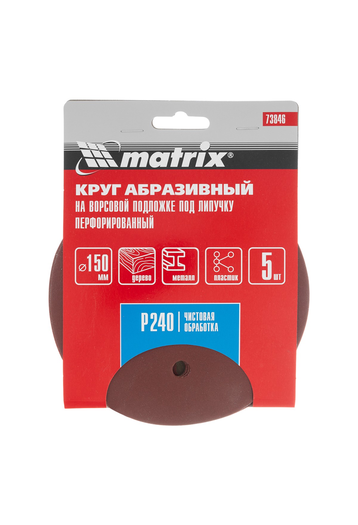 Перфорированный абразивный круг на ворсовой подложке под «липучку» Matrix 73846 с зернистостью Р 240, диаметром 150 мм, используется для сухого финишного шлифования металла, древесины, пластика и других поверхностей. Круг устанавливается на эксцентриковую (орбитальную) шлифовальную машинку с возможностью отвода воздуха или на дрель с помощью опорной насадки Matrix соответствующего диаметра. Мелкозернистый абразив Р 240 позволяет устранить мелкие недостатки перед окрашиванием.