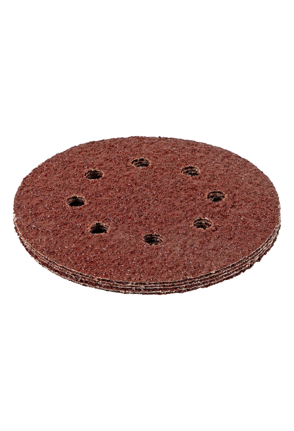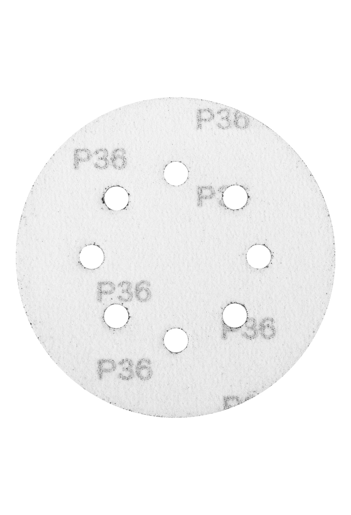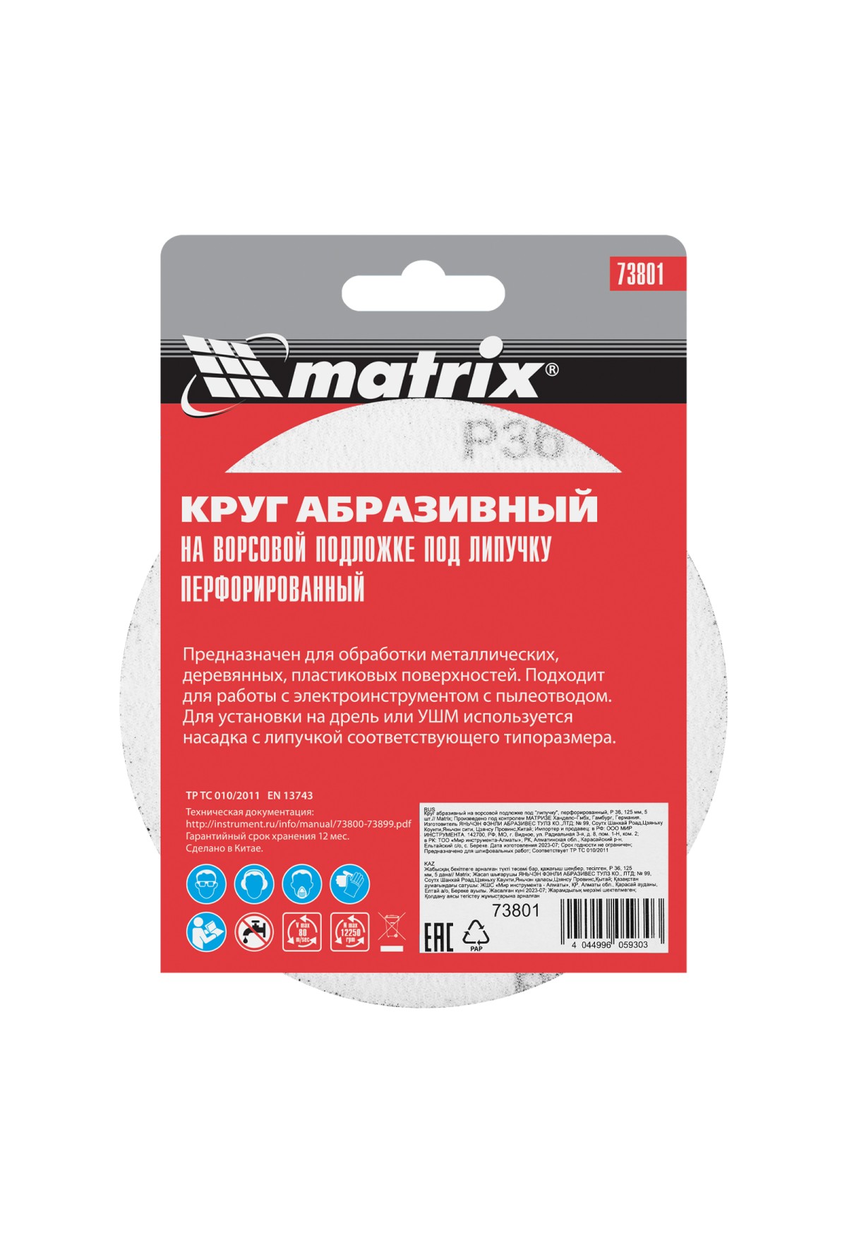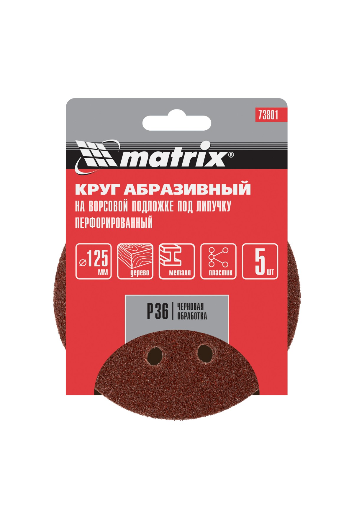 Перфорированный абразивный круг Matrix 73801 диаметром 125 мм, с крупнозернистым абразивом P 36, на ворсовой подложке под «липучку», 5 шт. в упаковке, используется для сухого чернового шлифования металла, древесины, пластика и других поверхностей. Позволяет избавиться от заусенцев, подходит для зачистки старого покрытия (краски/лака), удаления ржавчины, снятия слоя материала. Круг устанавливается на эксцентриковую (орбитальную) шлифовальную машинку с отводом воздуха или на дрель с помощью опорной насадки Matrix.