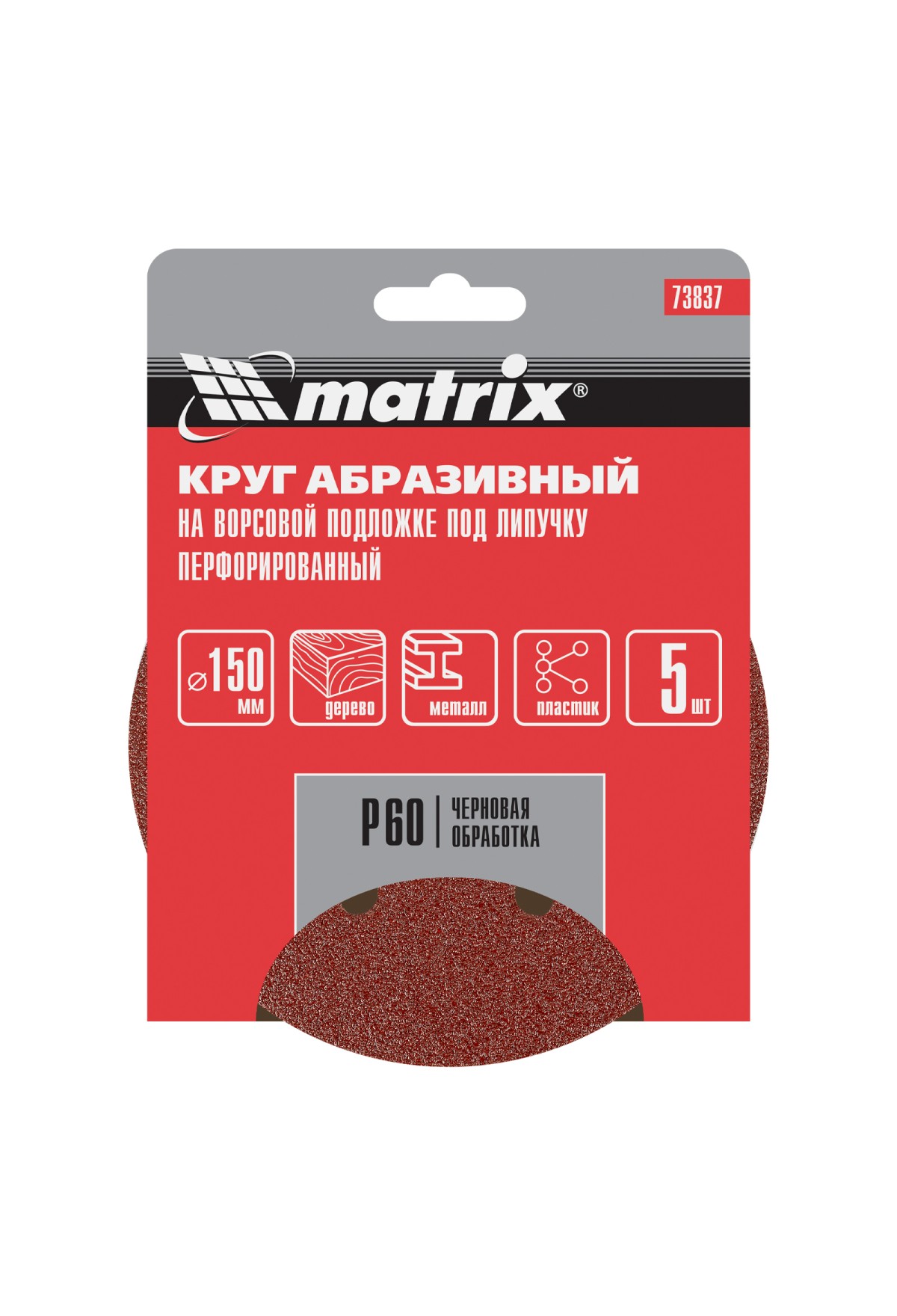 Перфорированный абразивный круг на ворсовой подложке под «липучку» Matrix 73837 с зернистостью Р 60, диаметром 150 мм, используется для сухого чернового шлифования металла, древесины, пластика и других поверхностей. Круг устанавливается на эксцентриковую (орбитальную) шлифовальную машинку с возможностью отвода воздуха или на дрель с помощью опорной насадки Matrix соответствующего диаметра. Крупнозернистый абразив Р 60 позволяет избавиться от заусенцев, подходит для зачистки старого покрытия (краски/лака), удаления ржавчины, снятия слоя материала.