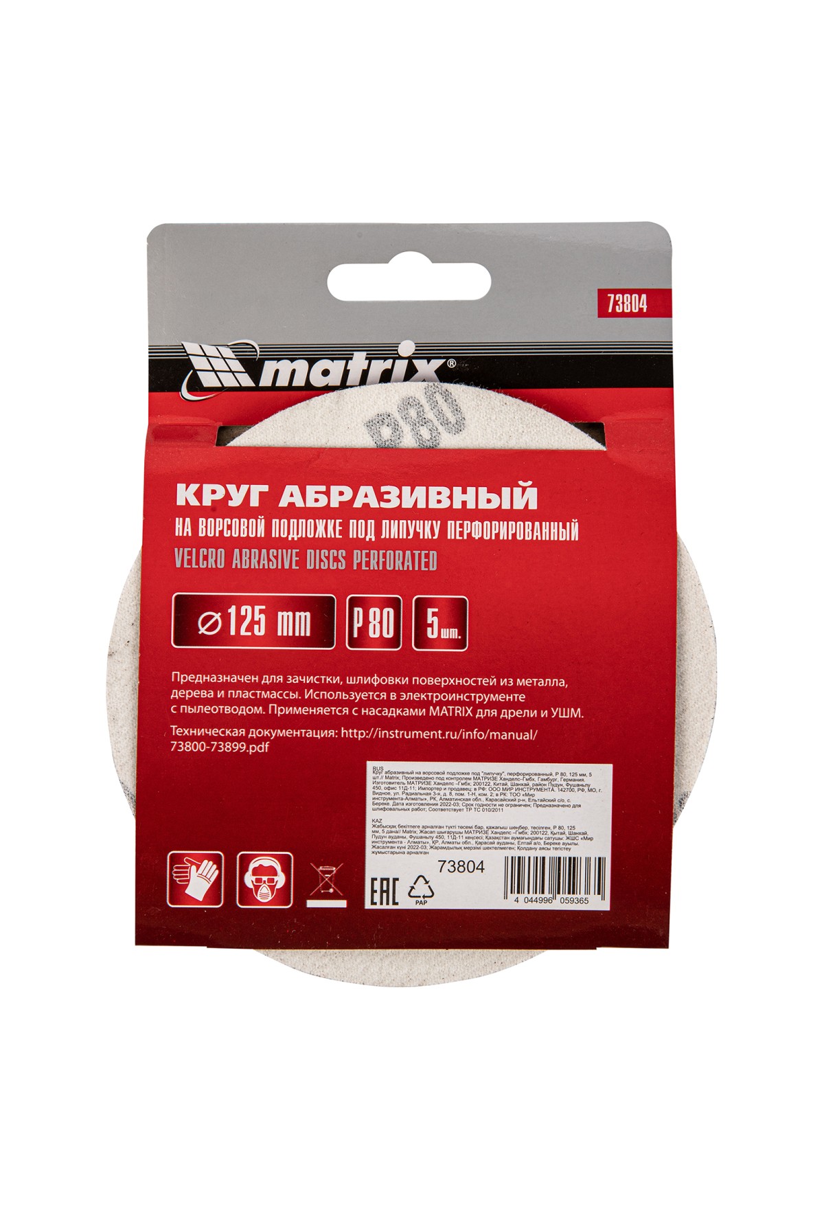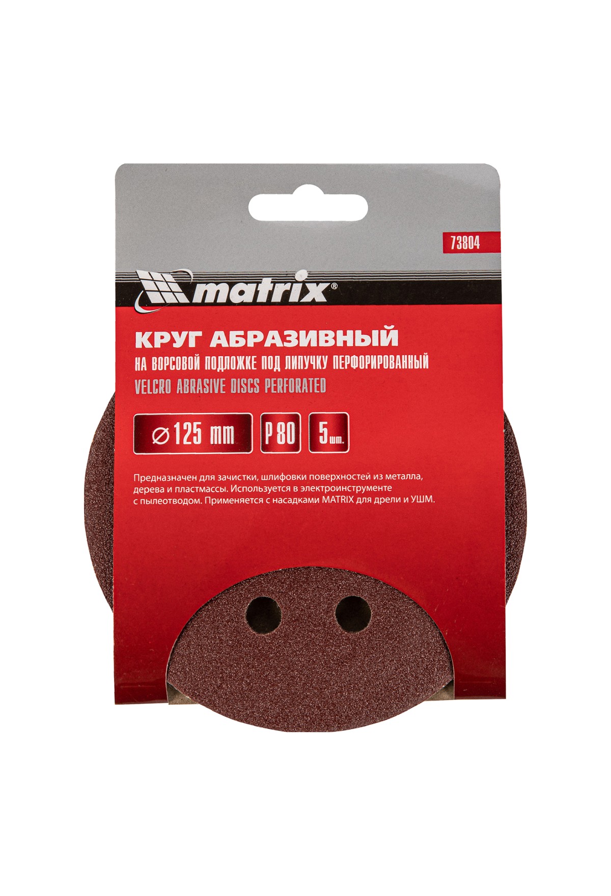 Перфорированный абразивный круг Matrix 73804 диаметром 125 мм, со среднезернистым абразивом P 80, на ворсовой подложке под «липучку», 5 шт. в упаковке, используется для сухого первичного шлифования металла, древесины, пластика и других поверхностей. Позволяет избавиться от заусенцев, подходит для зачистки старого покрытия (краски/лака), удаления ржавчины, снятия слоя материала. Круг устанавливается на эксцентриковую (орбитальную) шлифовальную машинку с отводом воздуха или на дрель с помощью опорной насадки Matrix.