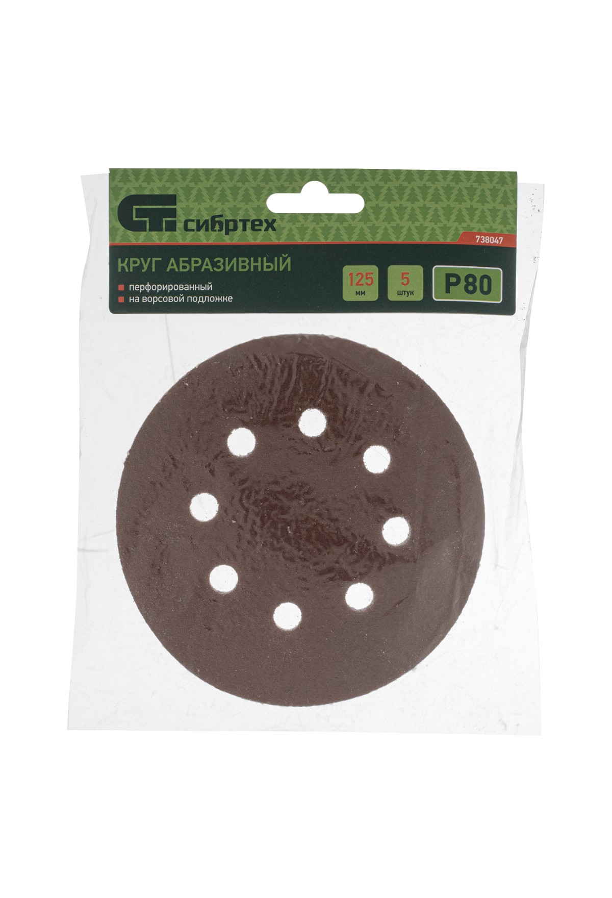Перфорированный абразивный круг Сибртех 738047 диаметром 125 мм, со среднезернистым абразивом P 80, на ворсовой подложке под «липучку», 5 шт. в упаковке, используется для сухого первичного шлифования металла, древесины, пластика и других поверхностей. Позволяет избавиться от заусенцев, подходит для зачистки старого покрытия (краски/лака), удаления ржавчины, снятия слоя материала. Круг устанавливается на эксцентриковую (орбитальную) шлифовальную машинку с отводом воздуха или на дрель с помощью опорной насадки.
