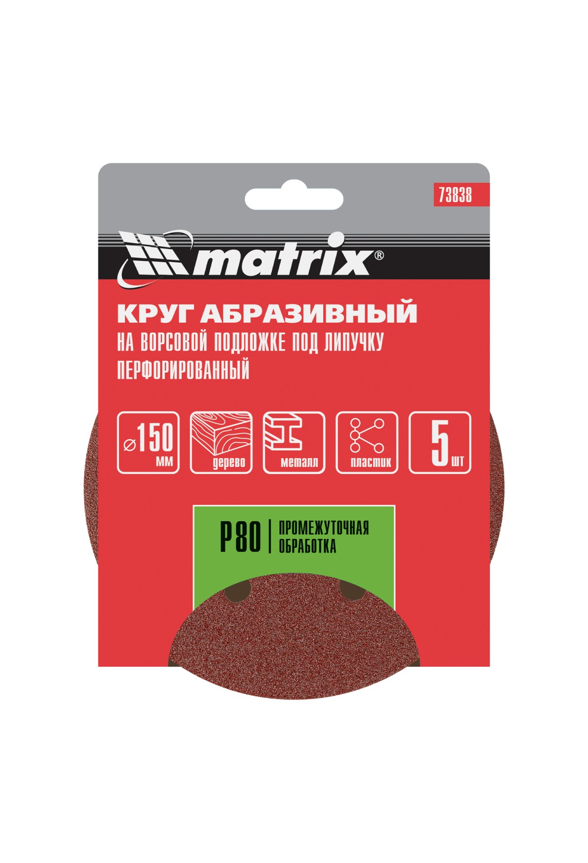 Технические характеристики Круг абразивный на ворсовой подложке под "липучку", перфорированный, P 80, 150 мм, 5 шт Matrix