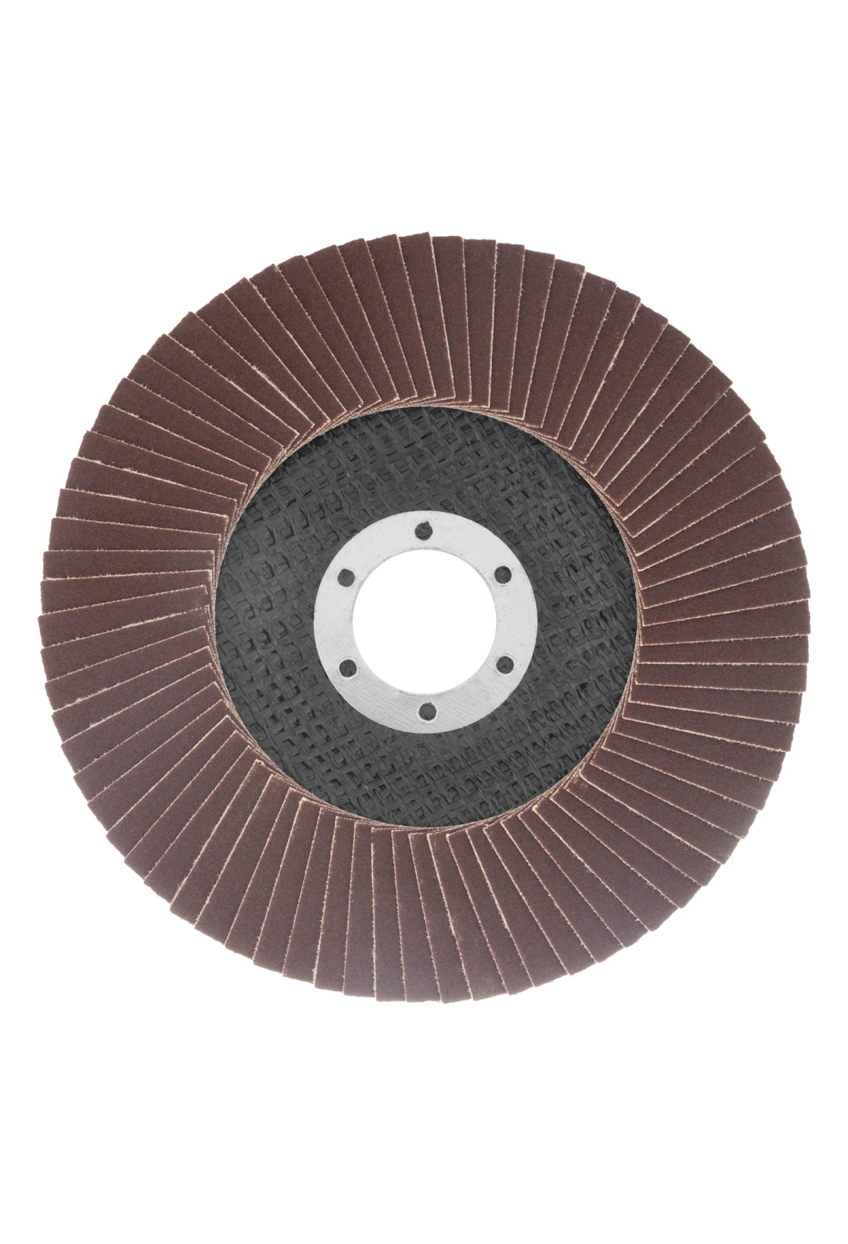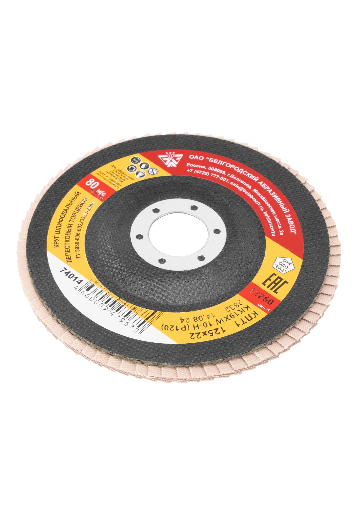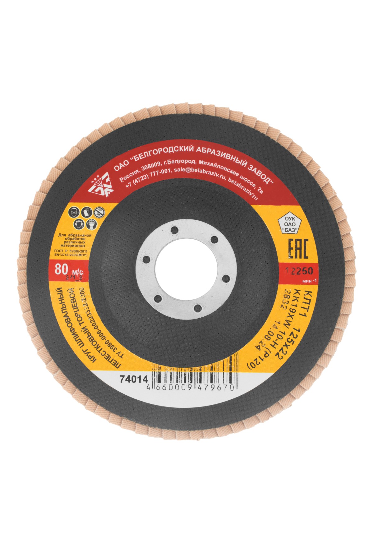 Круг лепестковый торцевой БАЗ КЛТ-1 74014 зернистостью Р120 (10Н), 125 х 22,2 мм, устанавливается в качестве оснастки на фланец УШМ с диаметром посадочного отверстия 22,2 мм. Он используется для чистовой обработки, торцевого и плоского шлифования древесины, металла, пластика. С помощью круга можно зачистить сварные швы, обработать заусенцы после резки, удалить налет ржавчины, лак или краску и т.д.