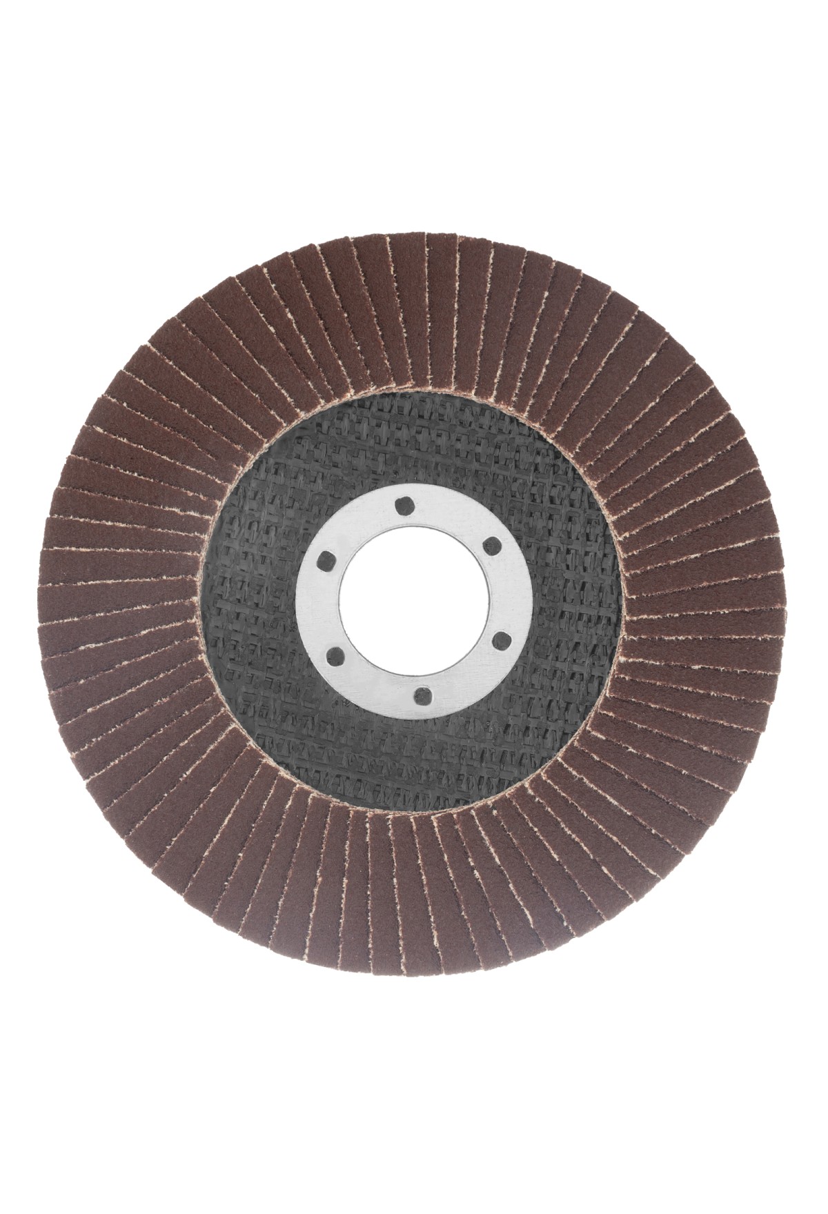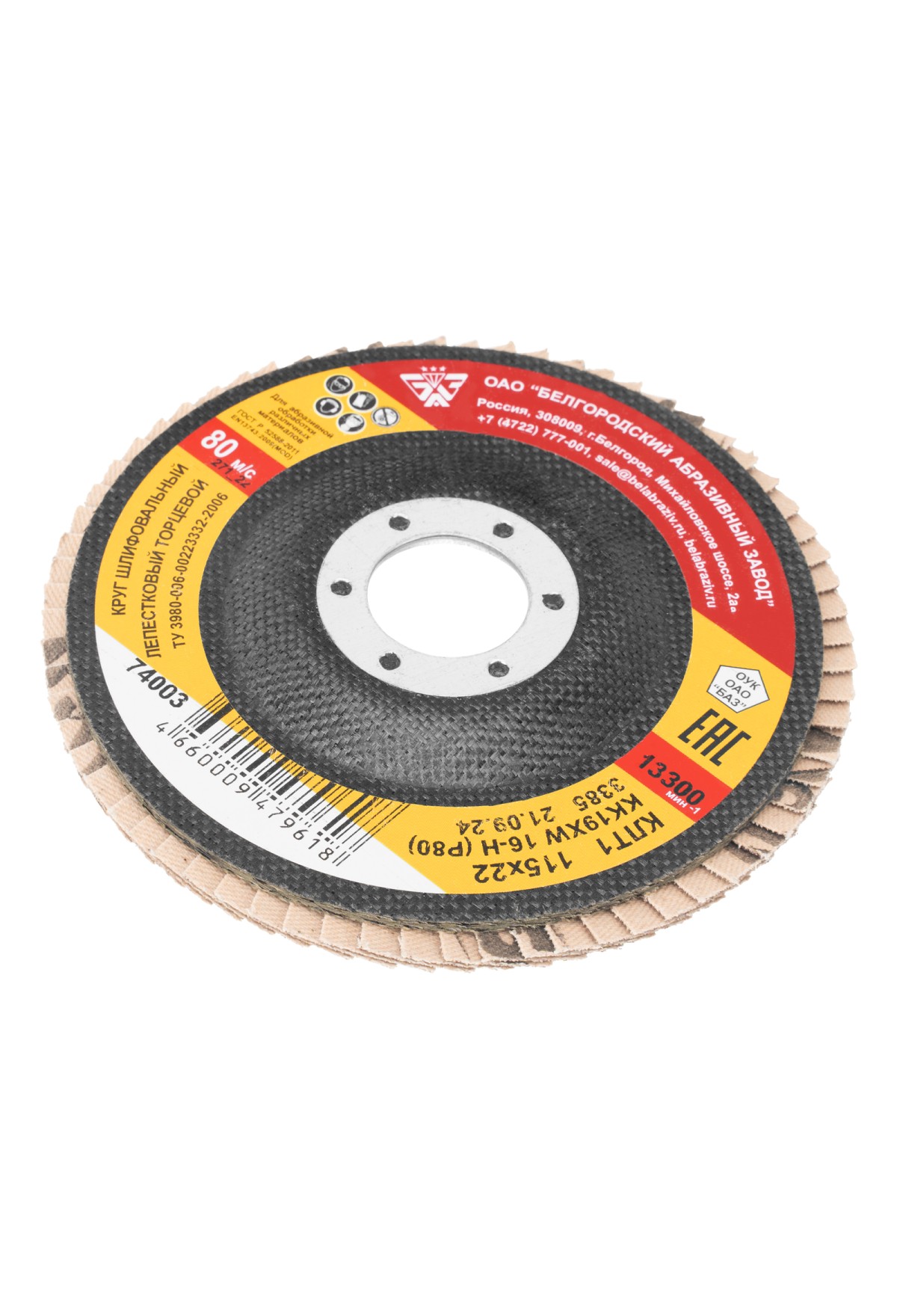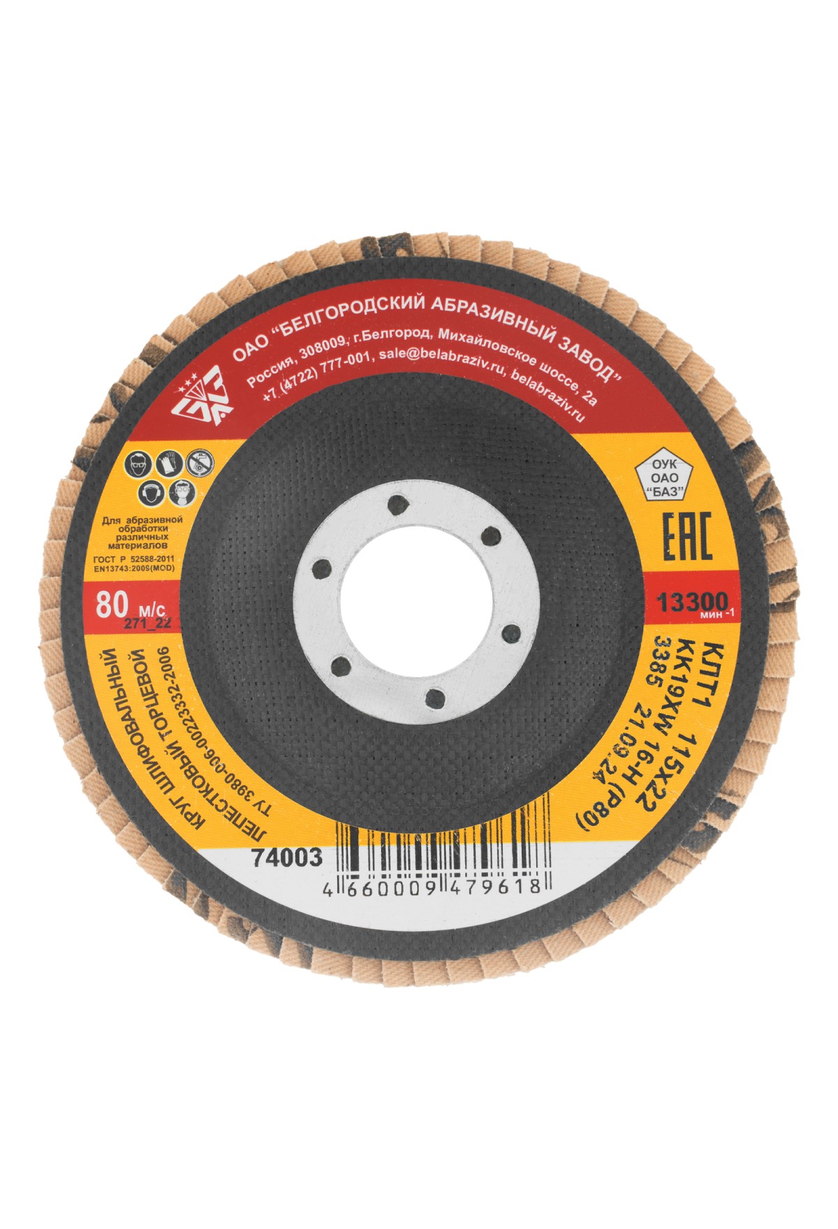 Круг лепестковый торцевой БАЗ КЛТ-1 74003 зернистостью Р80 (16H) и диаметром 115 мм устанавливается на фланец УШМ с диаметром посадочного отверстия 22,2 мм. Используется для промежуточной обработки, торцевого и плоского шлифования древесины, металла, пластика. С помощью круга можно зачистить сварные швы, острые углы после резки, удалить заусенцы, толстый слой ржавчины и краски, снять фаски и т.д.