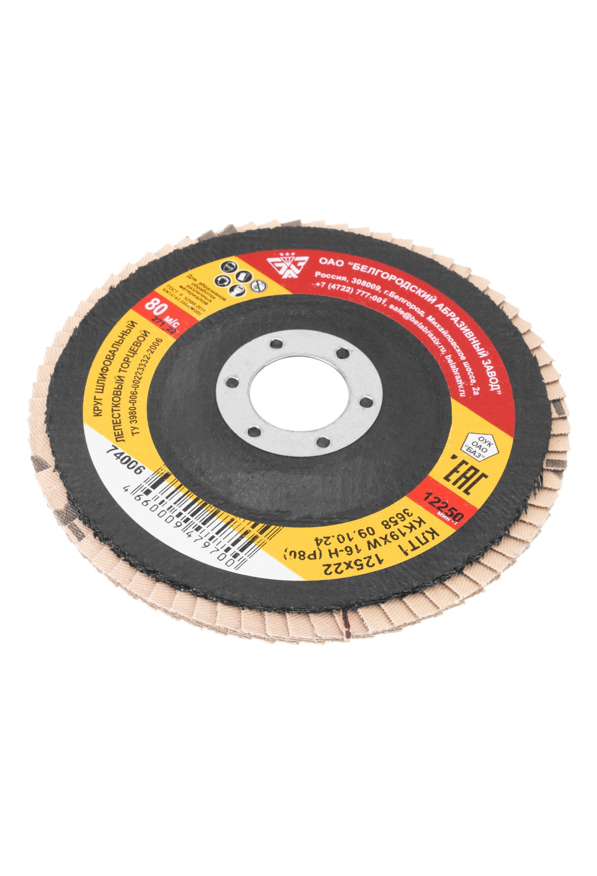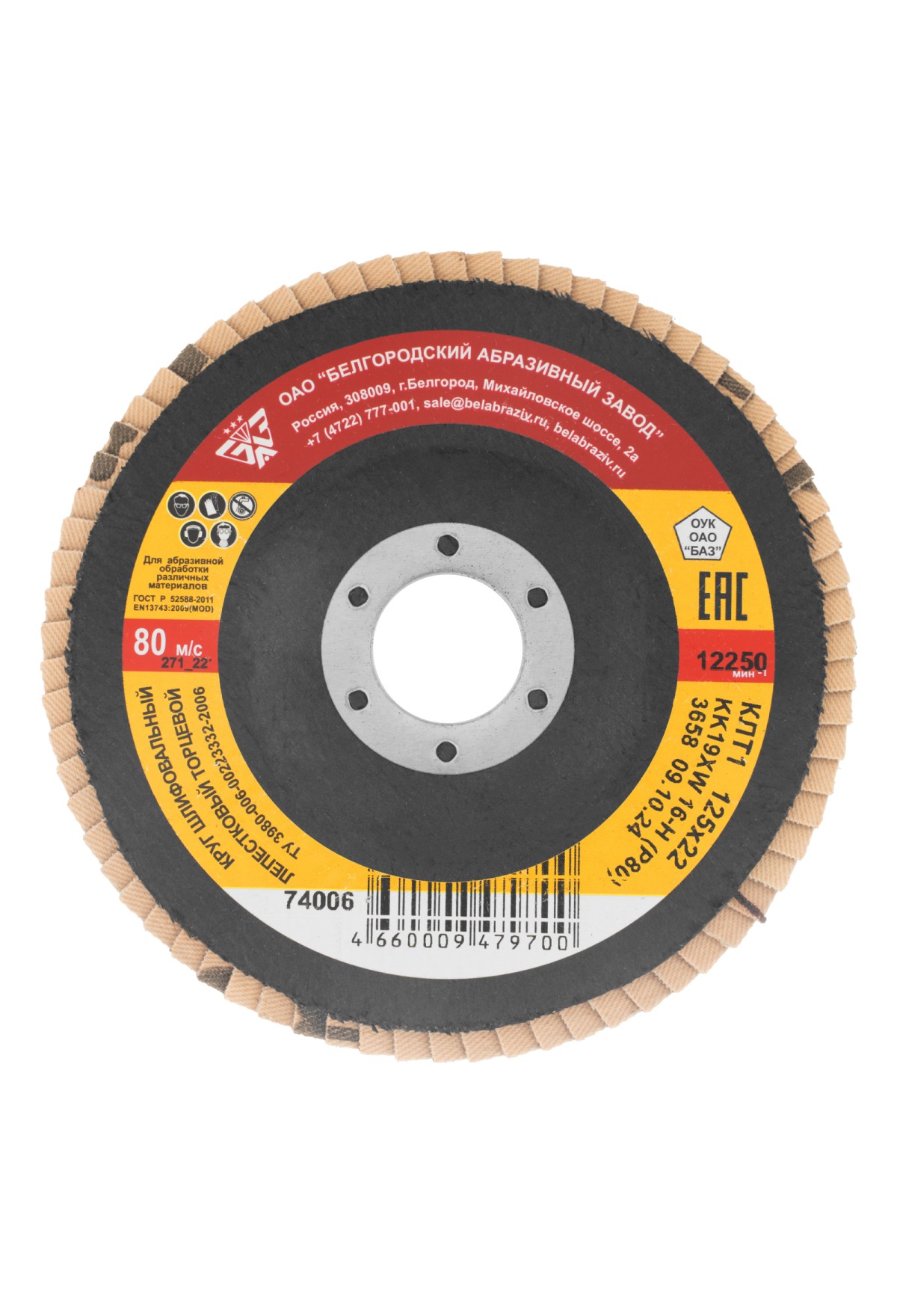 Круг лепестковый торцевой БАЗ КЛТ-1 74006 зернистостью Р80 (16Н), 125 х 22,2 мм, устанавливается в качестве оснастки на фланец УШМ с диаметром посадочного отверстия 22,2 мм. Он используется для промежуточной обработки, торцевого и плоского шлифования древесины, металла, пластика. С помощью круга можно зачистить сварные швы, острые углы после резки, удалить заусенцы, толстый слой ржавчины и краски, снять фаски и т.д.
