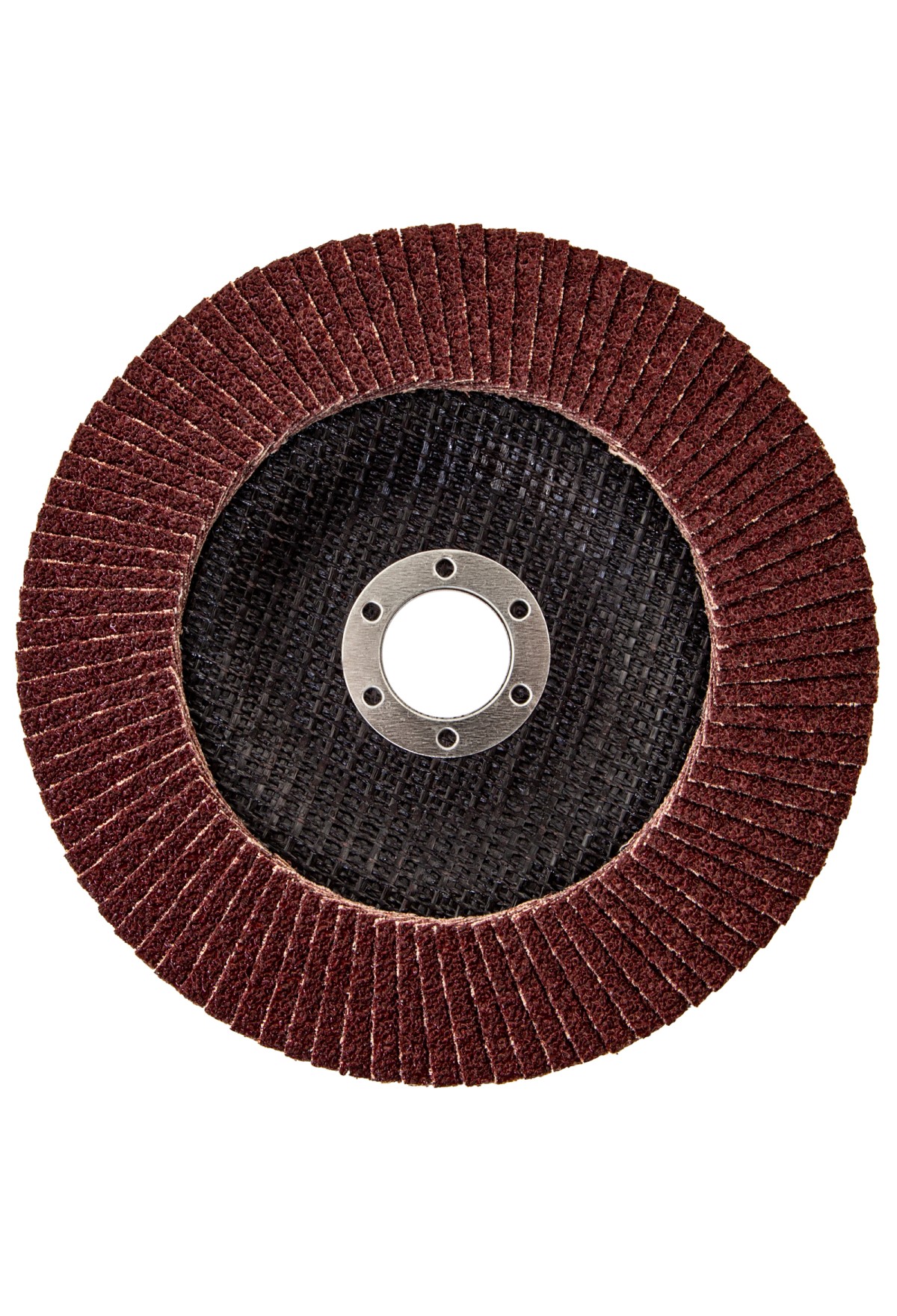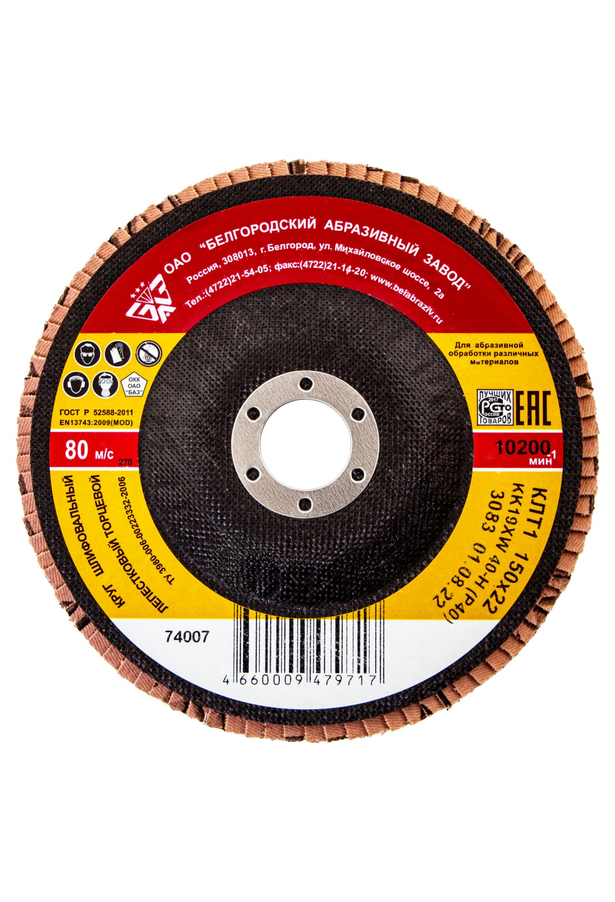 Круг лепестковый торцевой БАЗ КЛТ-1 74007 зернистостью Р40 (40Н), 150 х 22,2 мм, устанавливается в качестве оснастки на фланец УШМ с диаметром посадочного отверстия 22,2 мм. Он используется для грубой (черновой) обработки, торцевого и плоского шлифования из древесины, металла, пластика. С помощью круга можно зачистить сварные швы, острые углы после резки, удалить заусенцы, толстый слой ржавчины и краски, снять фаски и т.д.