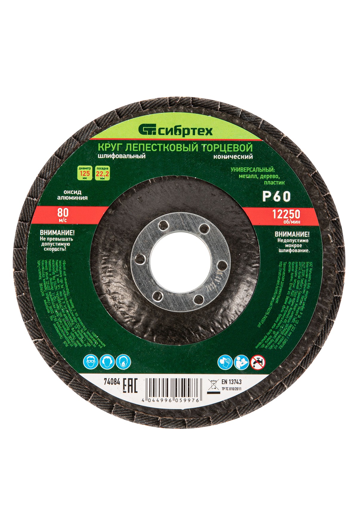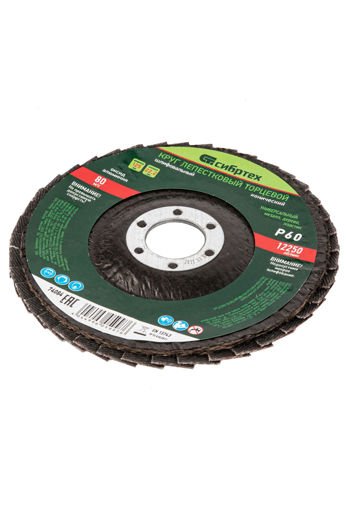 Круг лепестковый торцевой конический Сибртех 74084 размером 125 х 22,2 мм, с крупнозернистым абразивом Р60, устанавливается на углошлифовальные машины с соответствующим посадочным диаметром. Используется для грубой (черновой) обработки, торцевого и плоского шлифования древесины, металла, пластика. С помощью круга можно выполнить первичную зачистку сварных швов, убрать грубые дефекты, толстый слой ржавчины, краски и т.д.