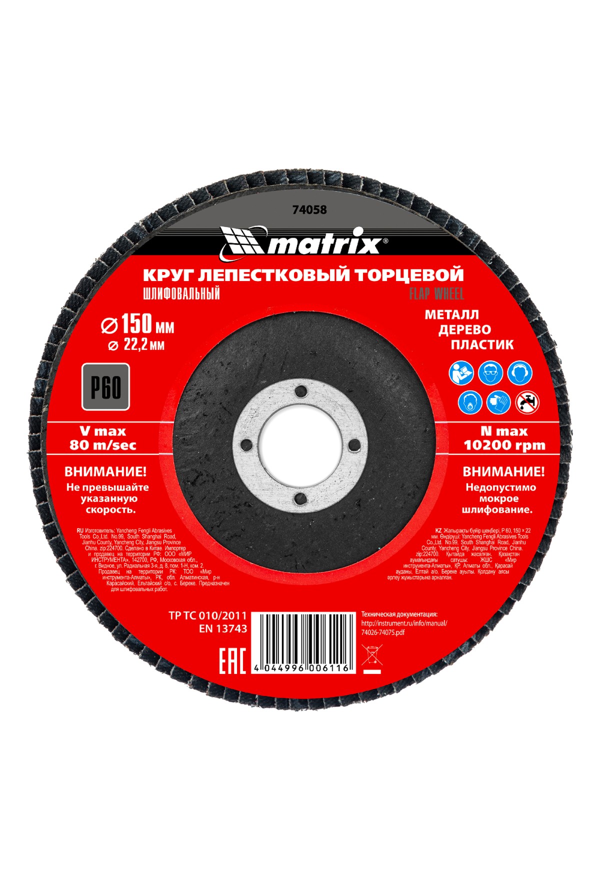 Технические характеристики Круг лепестковый торцевой, P 60, 150 х 22.2 мм Matrix