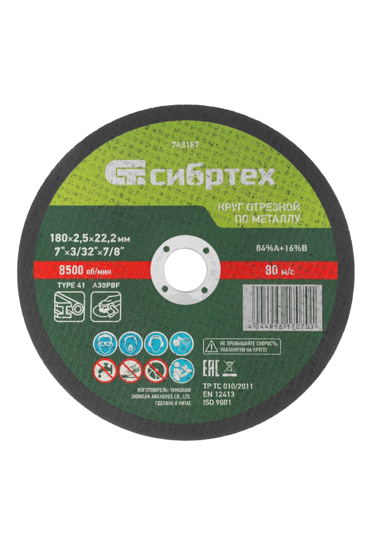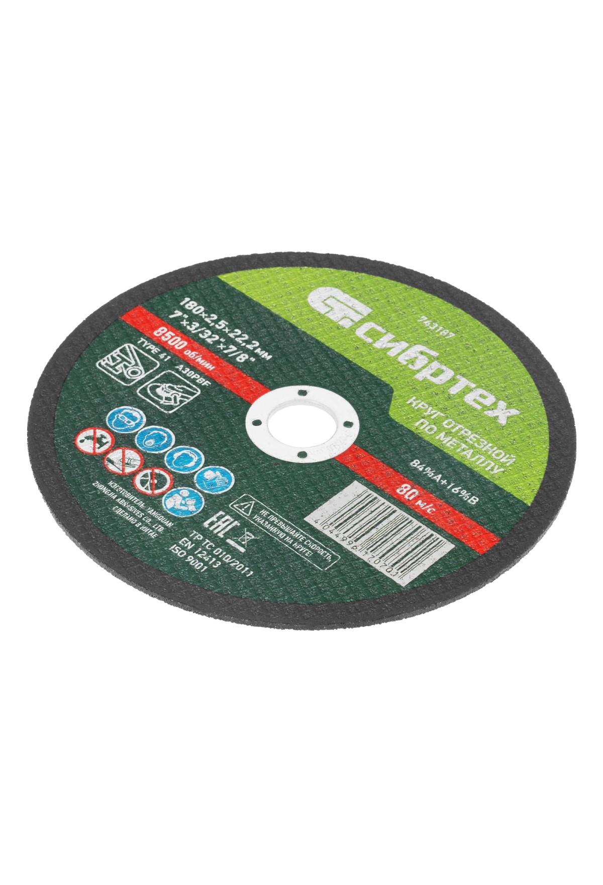 Технические характеристики Круг отрезной по металлу, 180 х 2.5 х 22.2 мм, 84%A+16%B Сибртех