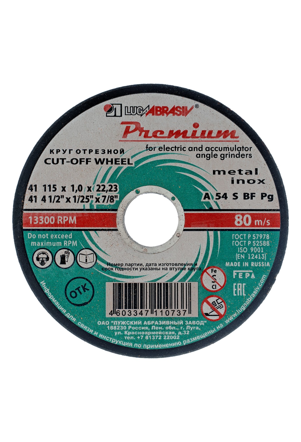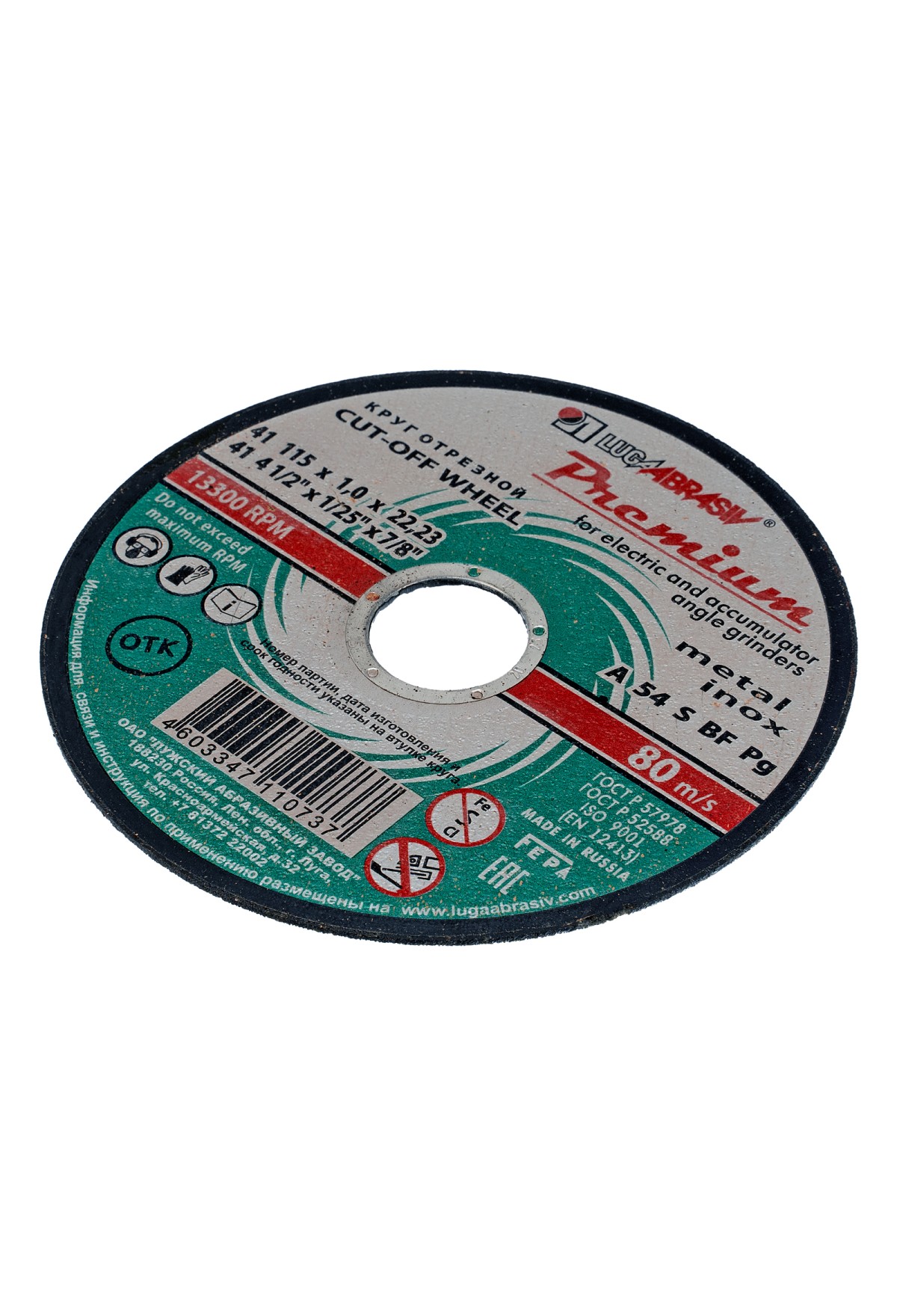 Технические характеристики Круг отрезной по металлу и нержавеющей стали, 115 х 1.0 х 22 мм, Премиум "Луга" Россия
