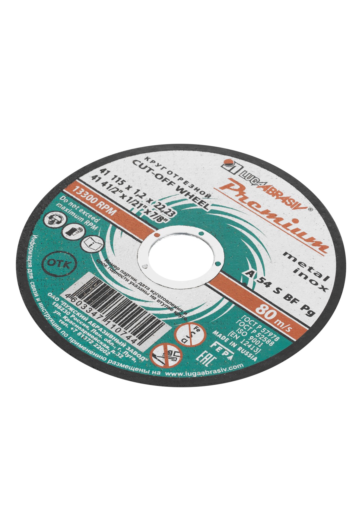 Технические характеристики Круг отрезной по металлу и нержавеющей стали, 115 х 1.2 х 22 мм, Премиум "Луга" Россия
