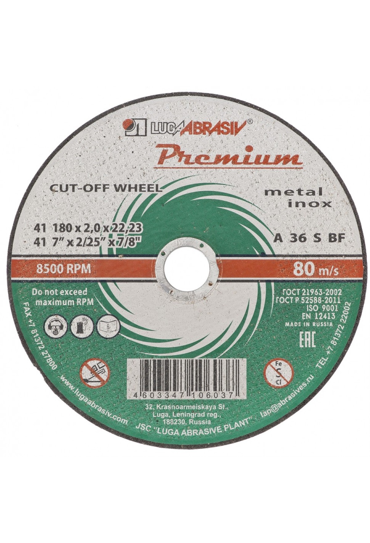 Круг отрезной по металлу и нержавеющей стали, 180 х 2.5 х 22 мм, Премиум "Луга" Россия