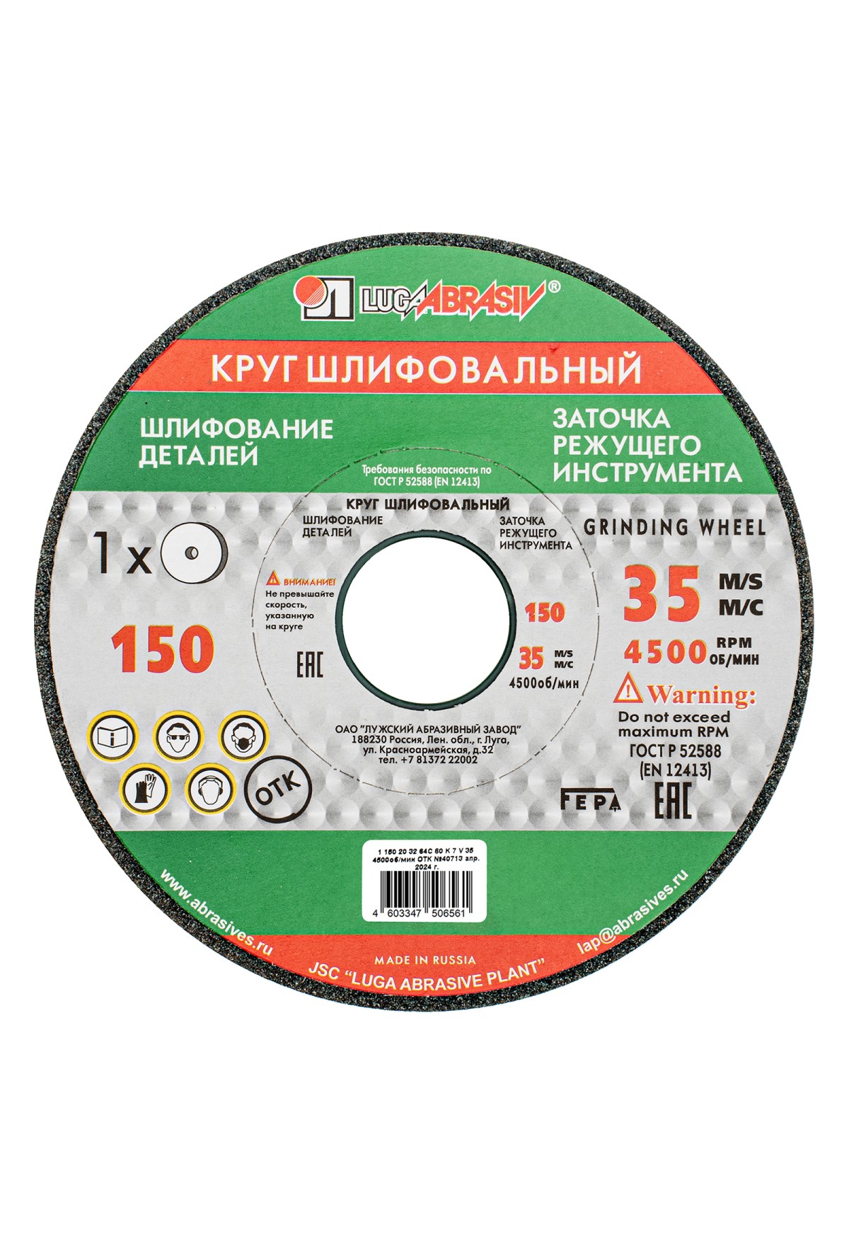 Технические характеристики Круг шлифовальный, 150 х 20 х 32 мм, 63С, F40, K "Луга" Россия