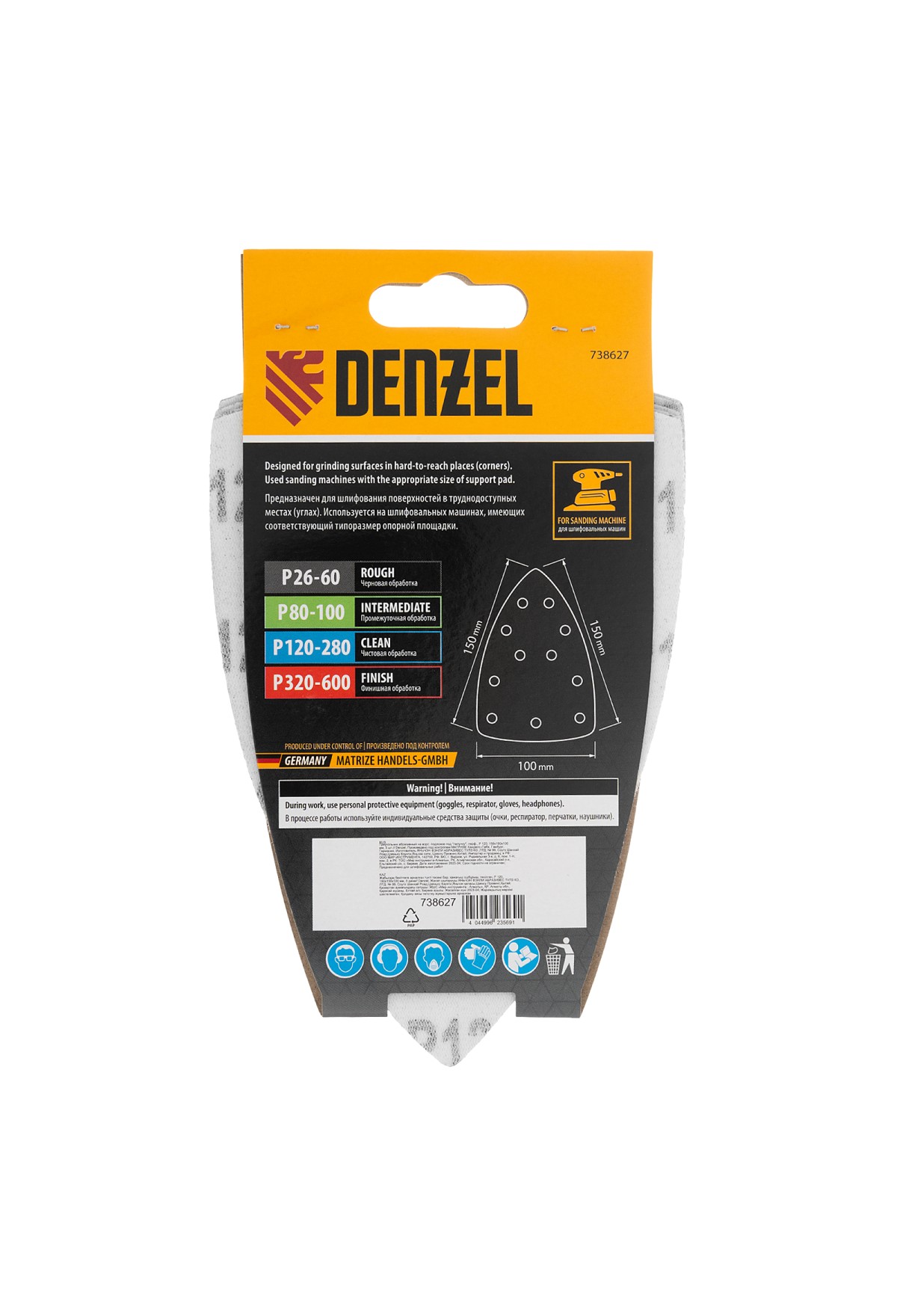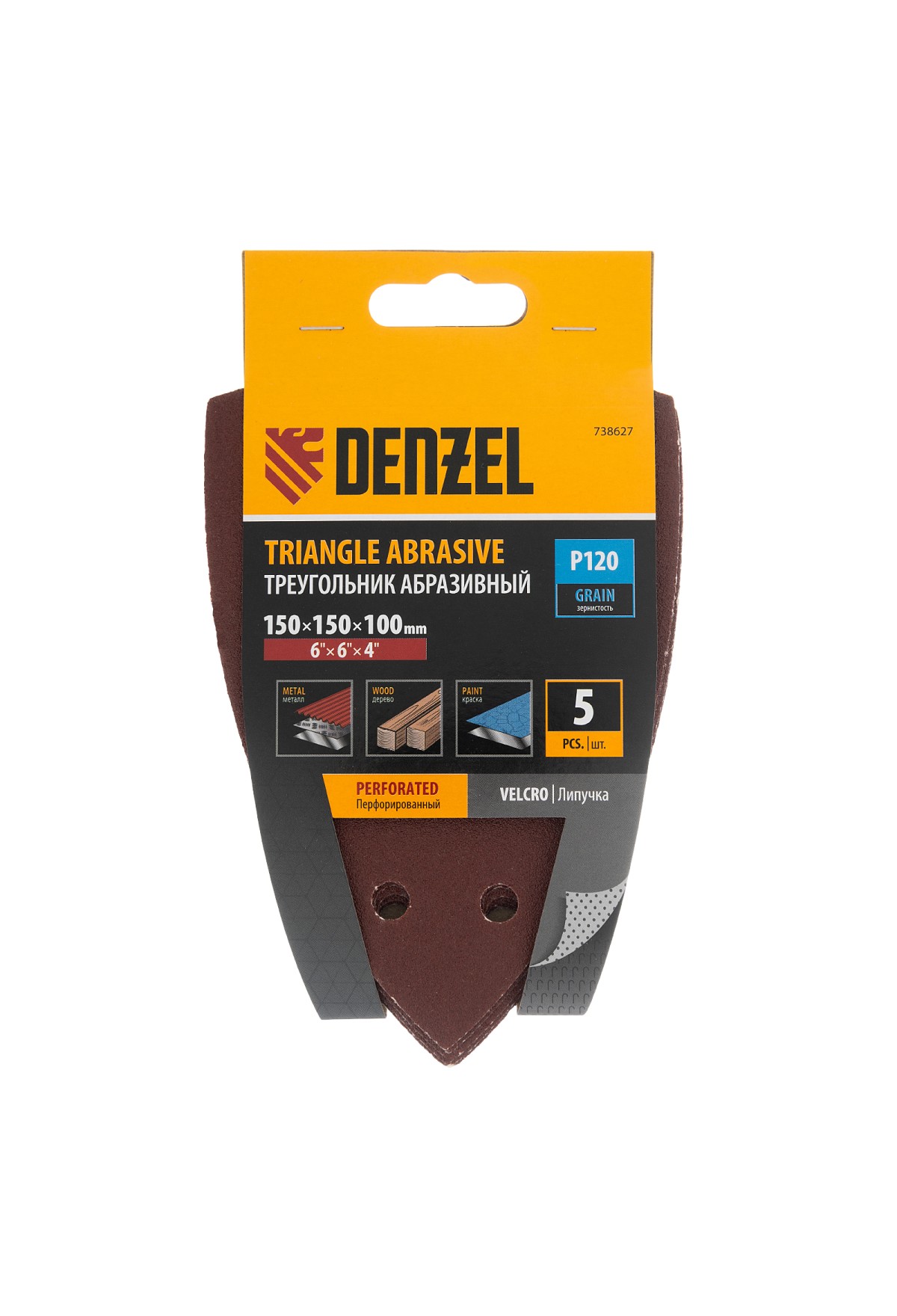 Абразивный перфорированный треугольник на ворсовой подложке «под липучку» Denzel 738627 размером 150 х 150 х 100 мм, 5 шт. в упаковке, имеет зернистость P 120 и предназначен для чистовой обработки металлических, деревянных и других деталей. Позволяет придать поверхности гладкость и подготовить ее к отделкеу, удобен для работы в углах и других труднодоступных местах. Треугольник совместим с плоскошлифовальной машиной Denzel 27614, также подходит для установки на другие шлифмашины с размером рабочей платформы 150 х 150 х 100 мм.