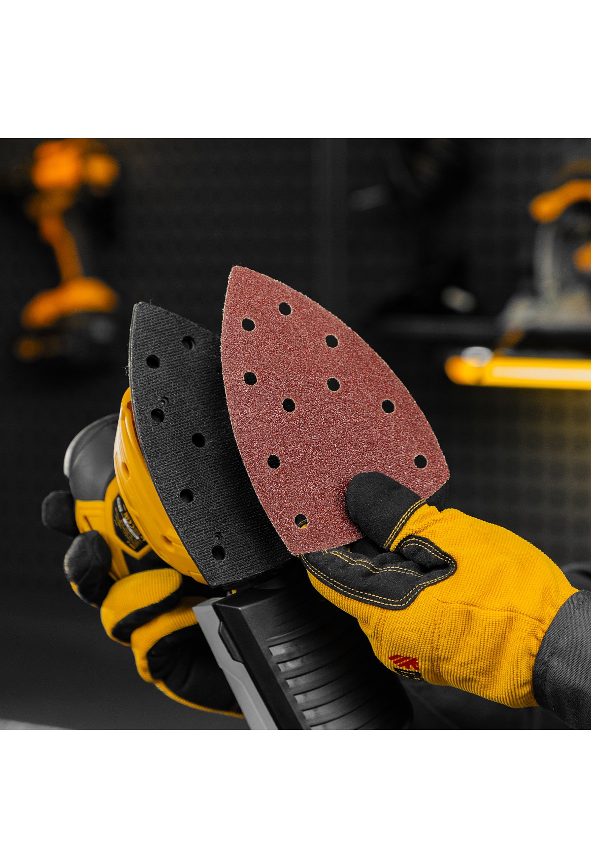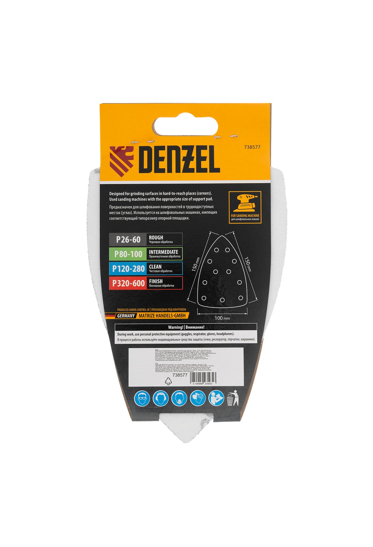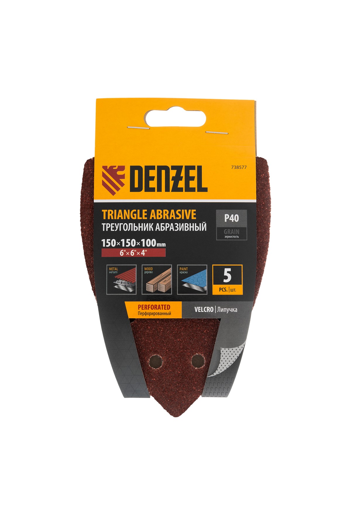 Абразивный перфорированный треугольник на ворсовой подложке «под липучку» Denzel 738577 размером 150 х 150 х 100 мм, 5 шт. в упаковке, имеет зернистость P 40 и предназначен для черновой обработки металлических, деревянных и других поверхностей. Позволяет удалять заусенцы, старые лакокрасочные покрытия и ржавчину, удобен для работы в углах и других труднодоступных местах. Треугольник совместим с плоскошлифовальной машиной Denzel 27614, также подходит для установки на другие шлифмашины с размером рабочей платформы 150 х 150 х 100 мм.