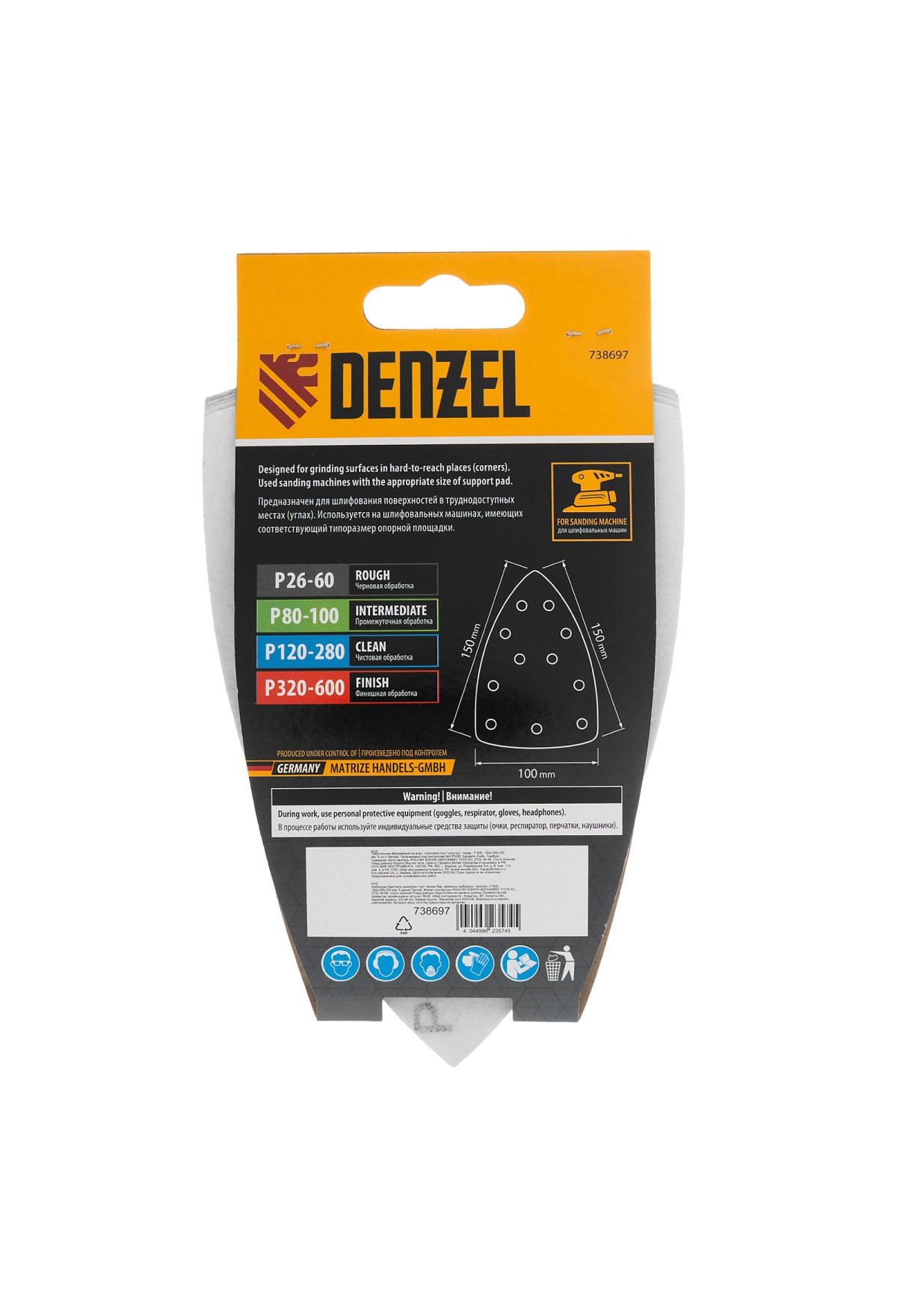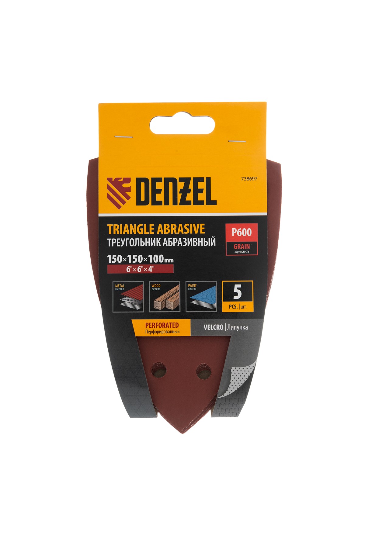 Абразивный перфорированный треугольник на ворсовой подложке «под липучку» Denzel 738697 размером 150 х 150 х 100 мм, 5 шт. в упаковке, имеет зернистость P 600 и предназначен для финишной обработки металлических, деревянных и других деталей. Позволяет устранять с поверхности мельчайшие шероховатости, удобен для работы в углах и других труднодоступных местах. Треугольник совместим с плоскошлифовальной машиной Denzel 27614, также подходит для установки на другие шлифмашины с размером рабочей платформы 150 х 150 х 100 мм.