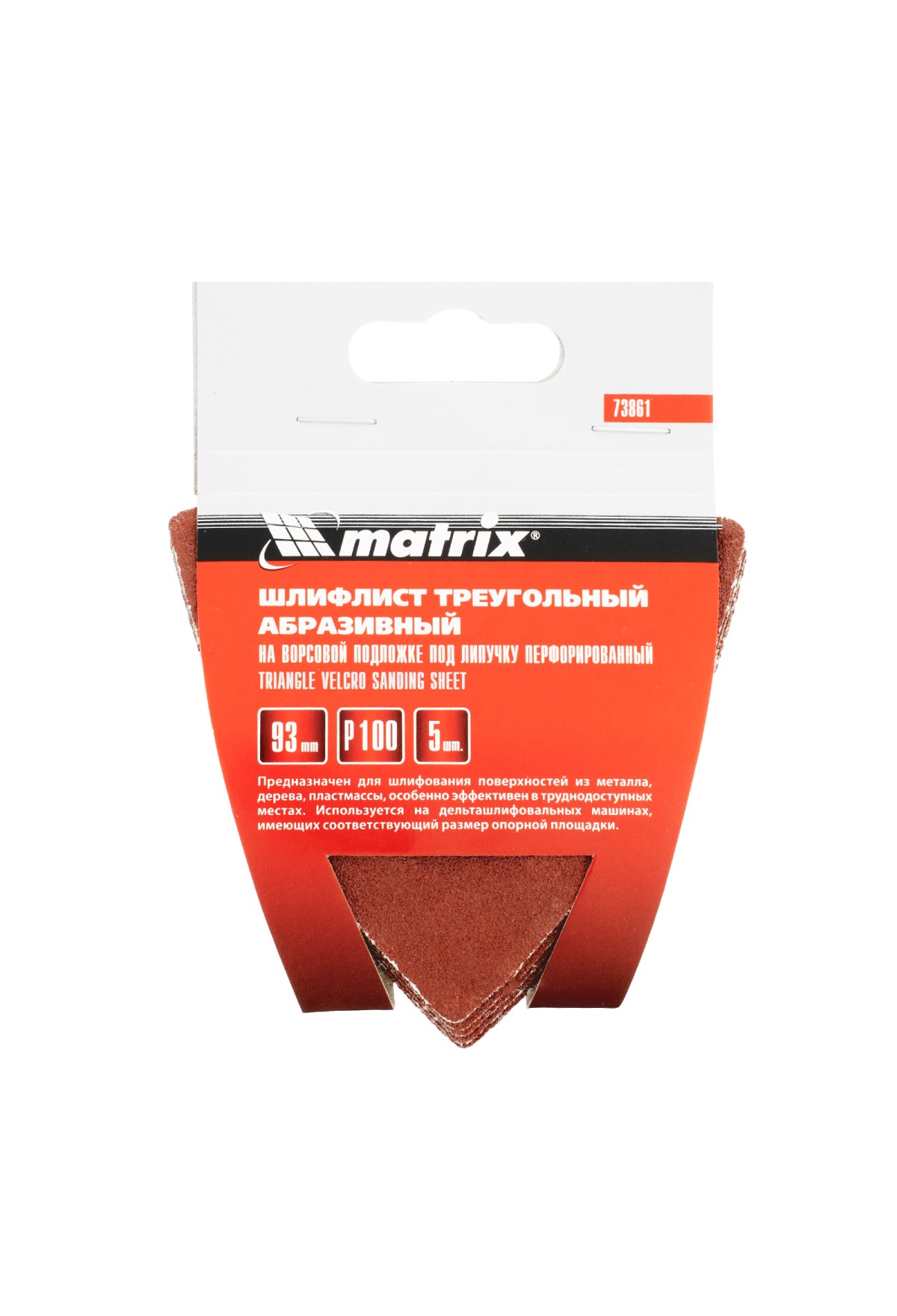 Перфорированный абразивный треугольник на ворсовой подложке под «липучку» Matrix 73861 шириной 93 мм, с абразивом Р 100, 5 шт. в упаковке, предназначен для установки на дельташлифовальную машину с соответствующим посадочным размером опорной площадки. С помощью абразива средней зернистости Р 100 можно произвести сухую чистовую зачистку древесины, металла, пластмассы, придав им гладкость. Треугольная форма облегчает обработку труднодоступных мест.