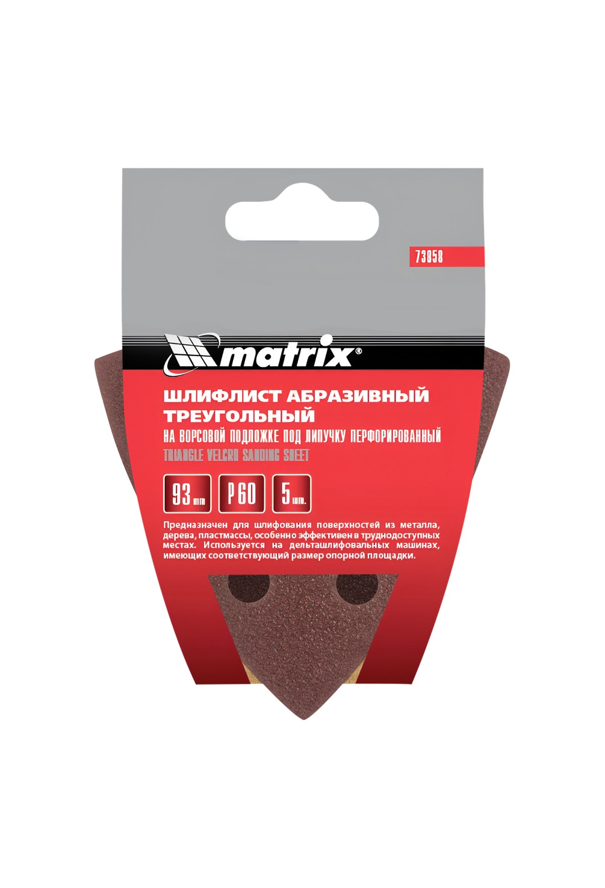 Технические характеристики Треугольник абразивный на ворсовой подложке под "липучку", перфорированный, P 60, 93 мм, 5 шт Matrix