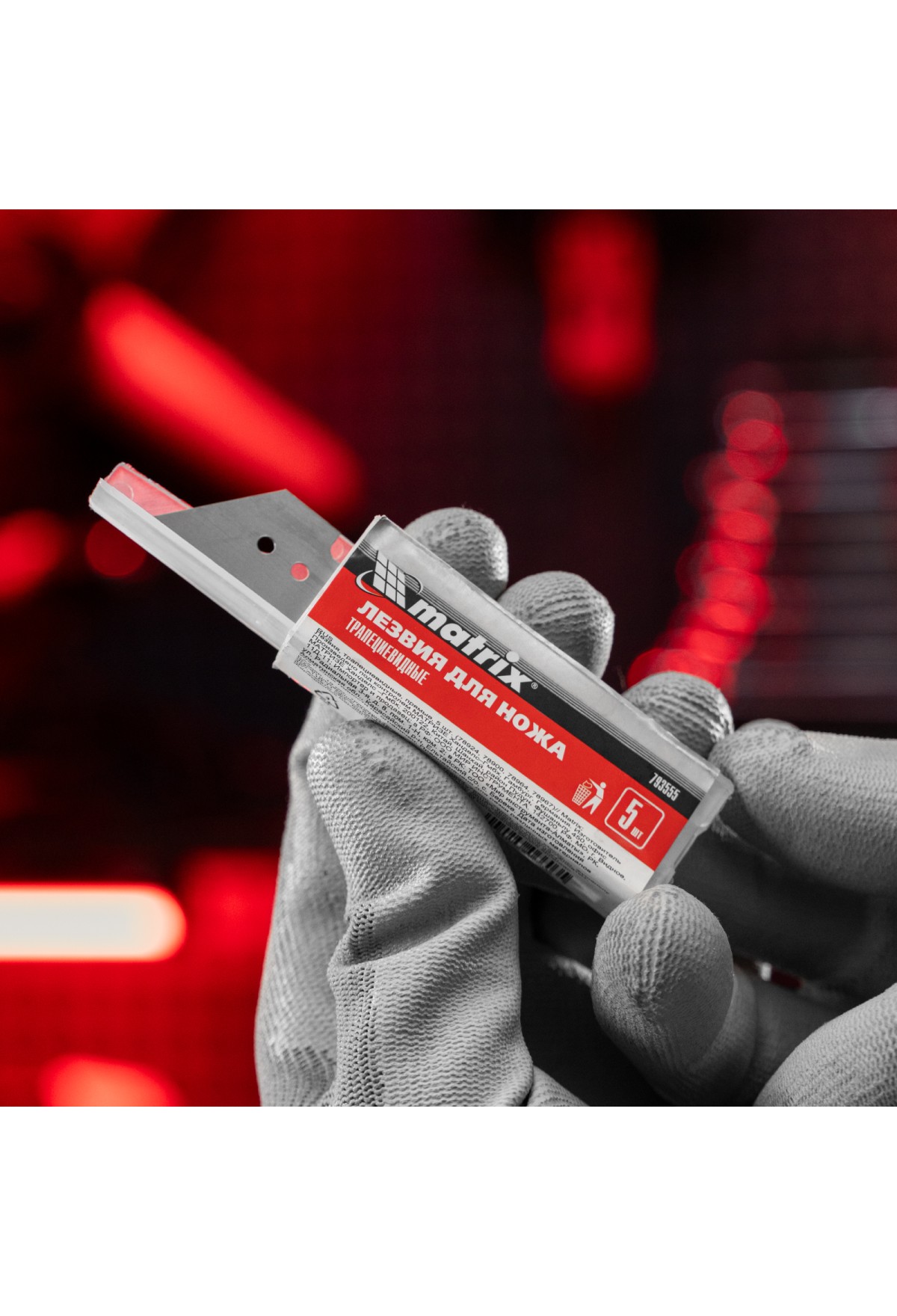 Прямые трапециевидные лезвия Matrix 793555 шириной 19 мм и длиной 61 мм, 5 шт. в упаковке, — сменные элементы для строительных ножей Matrix арт. 78924, 78964, 78900, 78967. Благодаря остро заточенным режущим кромкам они подходят для разрезания линолеума, картона, пластика, гипсокартона, раскройки обоев. Используются в профессиональной и бытовой сфере.