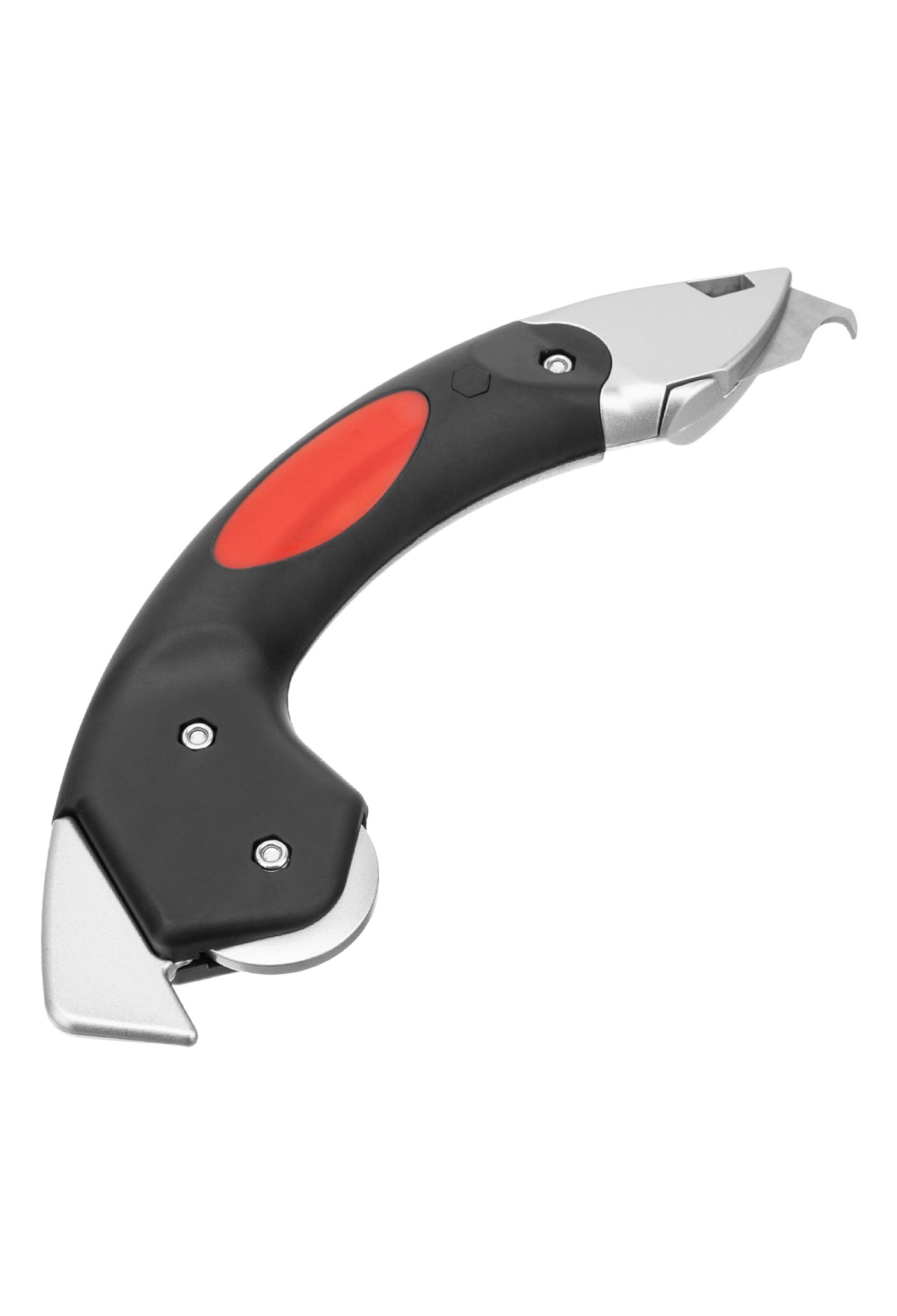 • Быстрое разрезание напольных и кровельных покрытий — нож комплектуется двумя лезвиями, в том числе крючкообразным.