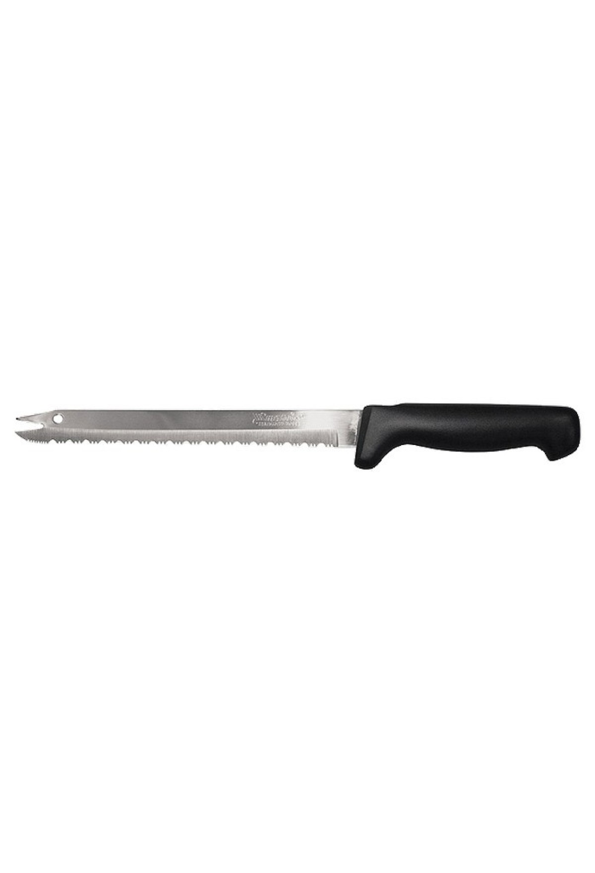 Универсальный кухонный нож Matrix KITCHEN «Щука» 79118 длиной 200 мм, со специальной заточкой лезвия полотна, используется для нарезания продуктов, в том числе замороженных или с большим количеством косточек. Наиболее подходящий инструмент для аккуратной резки мягких фруктов или хлеба — на лезвии имеются зазубрины, которые позволяют аккуратно разрезать корку или кожуру, не смяв при этом содержимое.