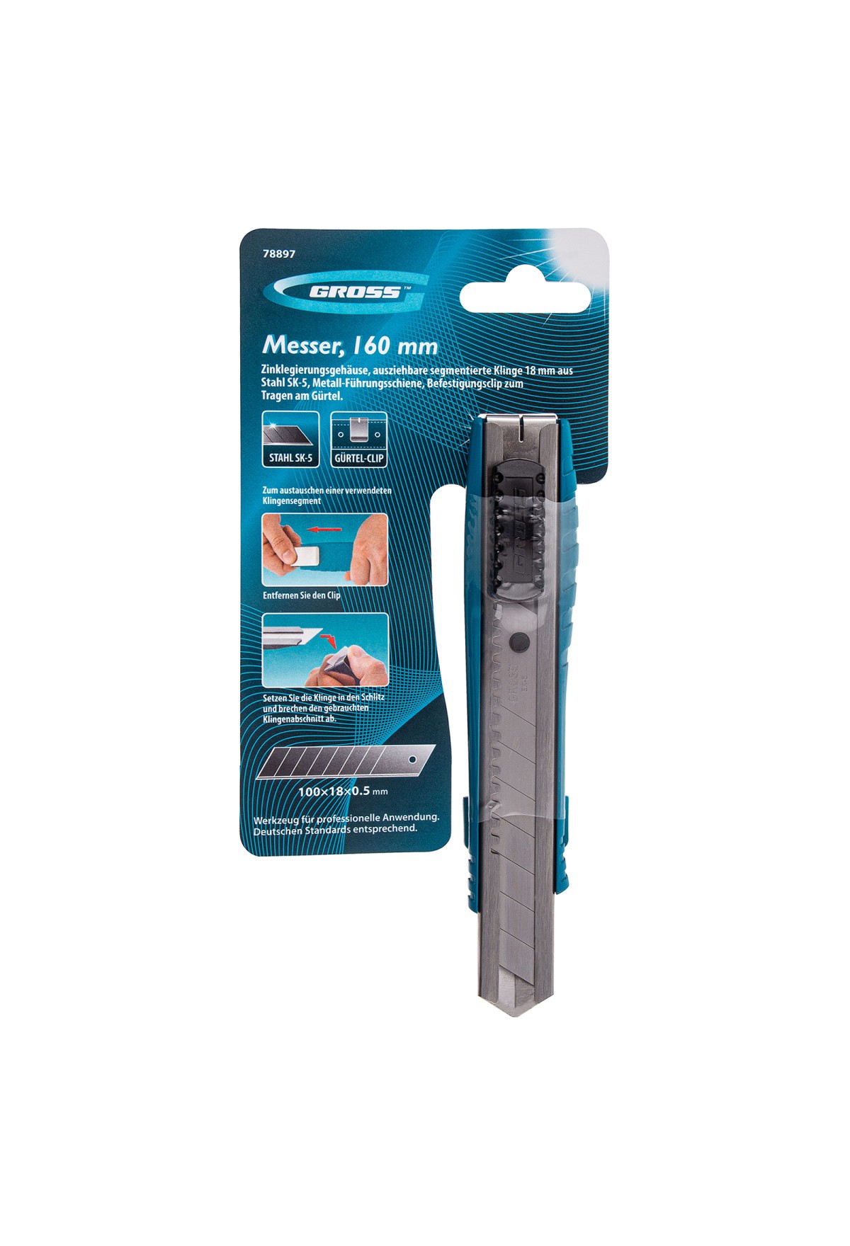 Нож Gross 78897 из стали SK-5, длиной 160 мм, в металлическом корпусе, с выдвижным сегментным лезвием шириной 18 мм, металлической направляющей и клипсой для ремня, — профессиональный инструмент, предназначенный для разрезания линолеума, картона, кожи, обоев и других материалов. Используется при проведении ремонтных и отделочных работ, будет полезен в хозяйстве.