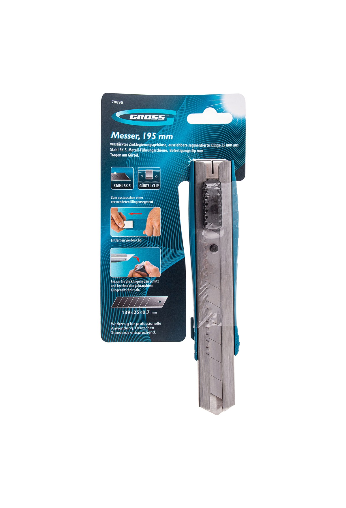 Технические характеристики Нож, 195 мм, металлический корпус, выдвижное сегментное лезвие 25 мм (SK-5), металлическая направляющая, клипса для ремня Gross