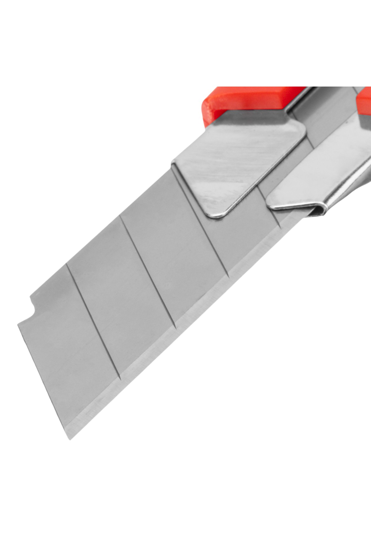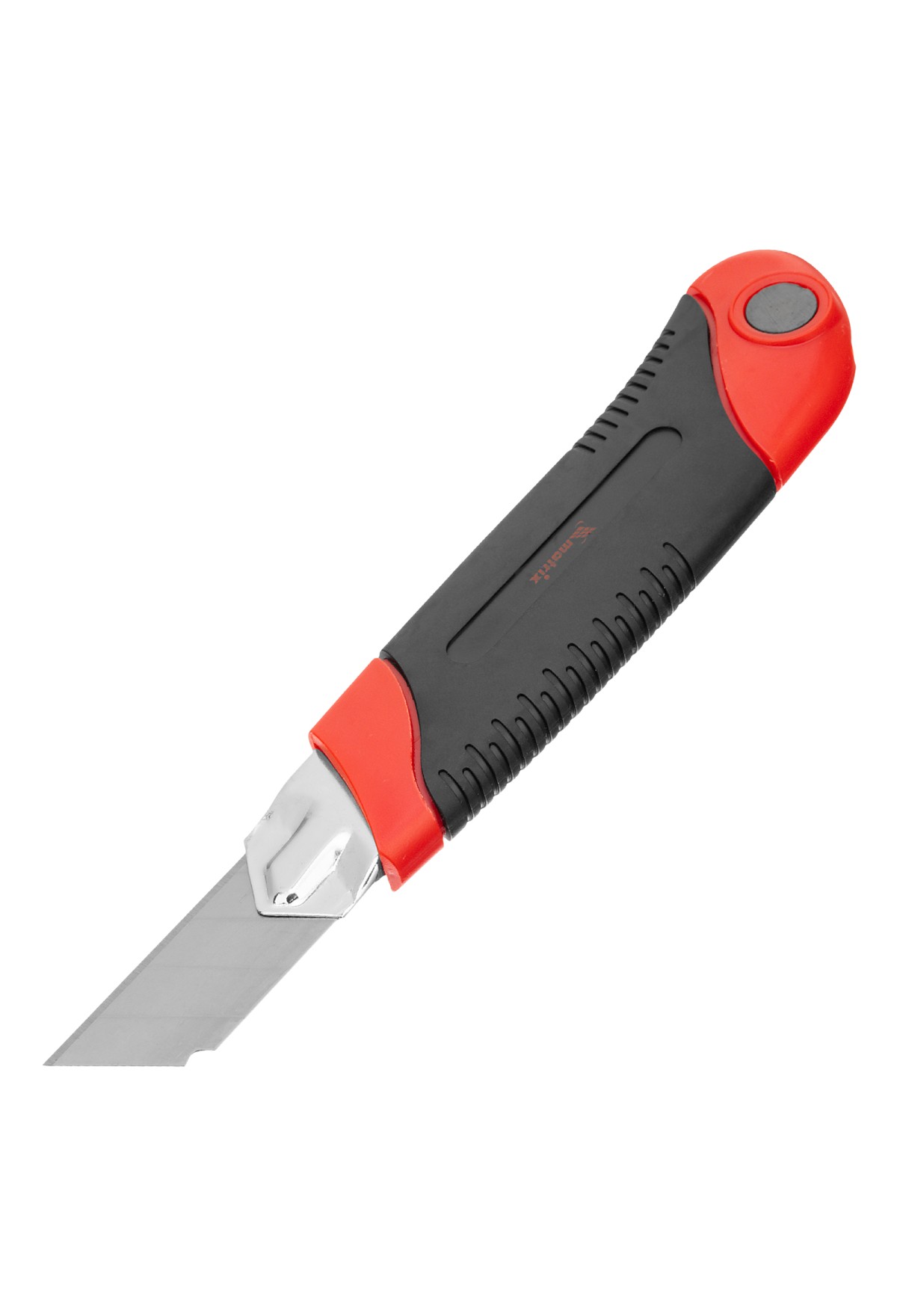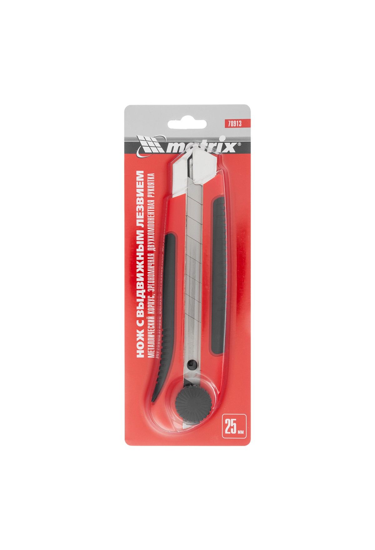 Нож Matrix 78913 в двухкомпонентном корпусе, с выдвижным лезвием шириной 25 мм, металлической направляющей, винтовым фиксатором и магнитом, применяется для разрезания картона, линолеума, ковролина, обоев, пленки, кожи и других мягких материалов. Лезвие выдвигается на необходимую длину и удерживается в этом положении при помощи винтового фиксатора. Нож пригодится во время проведения отделочных и ремонтных работ, а также поможет в решении бытовых задач.