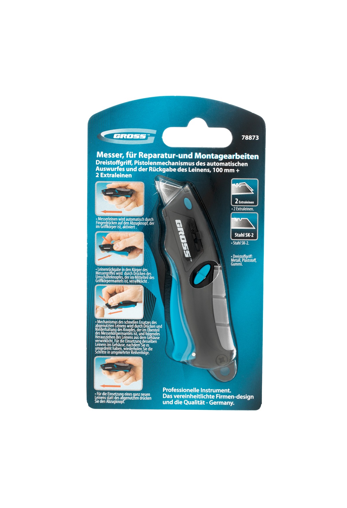 Ремонтно-монтажный нож Gross МИНИ 78873 длиной 100 мм, с трехкомпонентной рукояткой, автоматическим выбросом и возвратом лезвия, с 2 запасными полотнами, используется для разрезания бумаги, обоев, картона, линолеума, кожи. Прочное трапециевидное лезвие из высококачественной японской стали SK-2 толщиной 0,6 мм и шириной 9 мм не ломается и долго не тупится. Нож рекомендован для профессионального применения, а также будет полезен в быту.